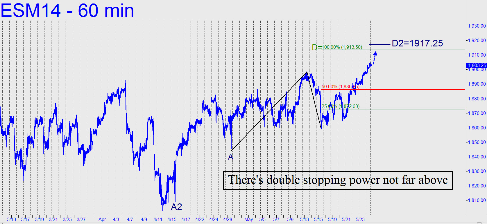 Traders should use the 1913.50 target shown as a lodestone on Monday. The opportunity to get long ahead of the move may pass with Sunday night’s session, but you can try shorting there in any case with an initial stop-loss at 1914.25. If the futures take out the stop, look for further, albeit limited, progress to the 1917.25 target of the larger, alternative pattern shown. _______ UPDATE (10:36 a.m. ET): This trade worked beautifully, since the futures peaked at 1914.00 just before dawn. I suggested covering half of the position in the chat room with the futures down near 1906.00. However, if you shorted only a single contract, or have already taken a partial profit, implement an impulse-leg-based stop-loss on the 5-minute chart. At the moment, that would imply stopping yourself out on an uncorrected thrust that exceeds two prior peaks, including one at 1911.50 recorded at 9:55 a.m. If I hear from two people in the chat room who got short and who are still short, I’ll establish a tracking position.