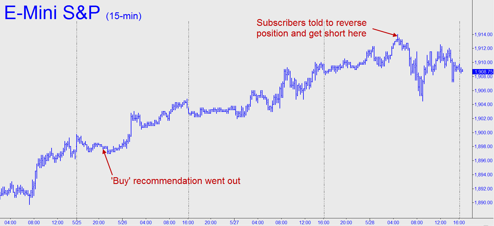 The latest E-Mini tout could have been worth as much as $1200 per contract to anyone who was paying attention and prepared to act. Specifically, with the futures trading around 1898.00 Monday evening, I suggested getting long for a rally to exactly 1913.50. I further recommended getting short at that target, a Hidden Pivot resistance, using an ultratight, three-tick (!) stop-loss at 1914.25. In the actual event, the futures rallied to an intraday peak at precisely 1914.00 yesterday morning, then dove to 1905.00 in the first hour. Here’s the actionable portion of the recommendation exactly as it appeared: ‘Traders should use the 1913.50 target shown as a lodestone on Monday. The opportunity to get long ahead of the move may pass with Sunday night’s session, but you can try shorting there in any case with an initial stop-loss at 1914.25.’