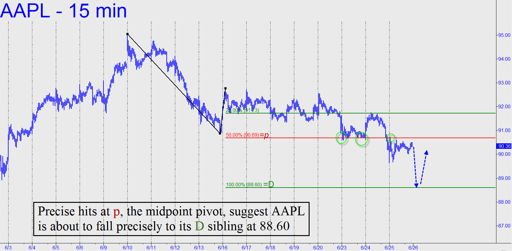AAPL’s 7-for-1 split may have broadened investor interest in the stock, but a paradoxical result is that it has killed the wild spasms that Wall Street’s thieves, psychopaths, thimble-riggers, bunco men and child molesters use to make indecent money in the market. Still worse is that the split seems to have saddled the stock with the weight of skepticism that is alien to the institutional mind. Subdued though it be, however, AAPL looks almost certain to fall to the 88.60 target, and to take a tradable bounce from that Hidden Pivot that should be precise within a few cents. Do what you will with that forecast, but if your objective is merely to be entertained you should jot my target down and set an alert. _______ UPDATE (June 26, 9:12 p.m. EDT): It would take a print at 92.78 to invalidate the 88.60 target given above, but as a practical matter, a mere 91.75 would rob the target of its trading value.