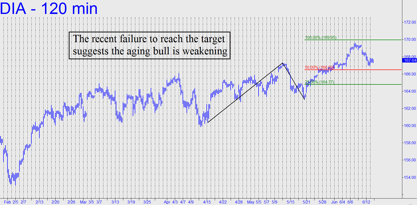 It’s not a healthy sign that the buying binge begun on May 20 couldn’t quite reach the 169.95 target shown. Still, because the subsequent decline has yet to take out any significant lows, we’ll need to give our grudging respect to this aging and possibly enfeebled bull. I’ll signal any shorting opportunities in the chat room and via email (to those who have signed up for email notification on their Account page). In the meantime, however, we should remain alert to any bullish trading possibilities, since our success at exploiting them can provide the extra cushion we need to get short fearlessly at new-record and swing highs.