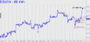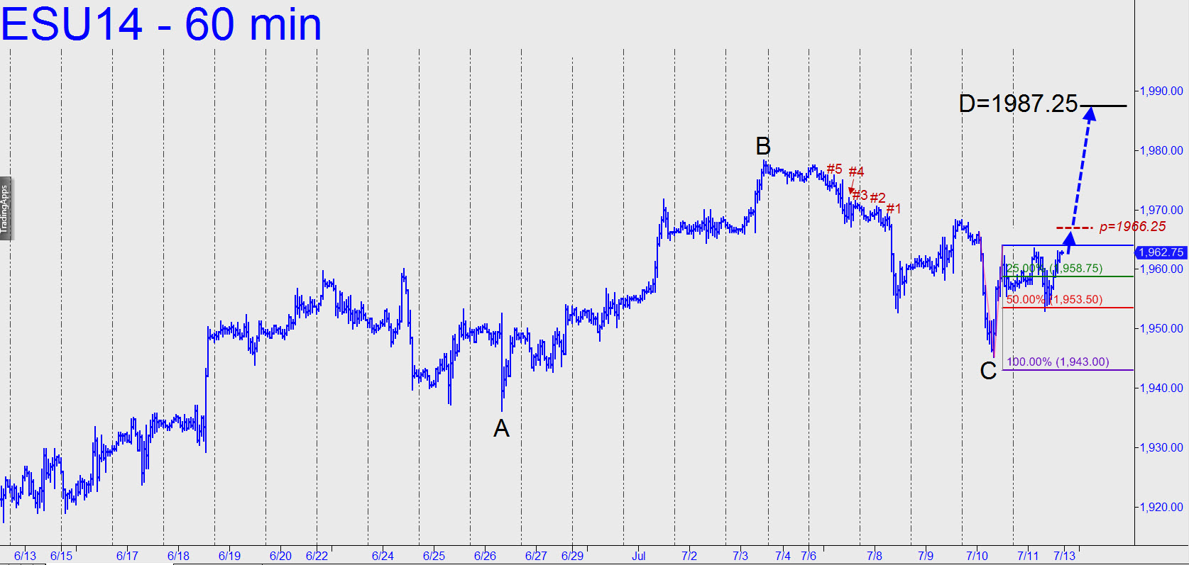 The fact that Friday’s low occurred within a tick of a 1953.50 Hidden Pivot ‘midpoint support’ (see inset) is evidence that the larger bull trend will continue. This follows the rule that strong bull trends produce corrections that only get halfway to their targets. Under the circumstances, we should use the 1987.25 target shown as our price objective for the next leg up. That would equate to a Dow rally of about 220 points, and it would be predicated on a decisive move past the 1966.25 midpoint pivot of the larger ABCD pattern shown. For purposes of getting aboard, the hourly chart has many hooks that can be used to fine-tune your entry signal. Pullbacks from just any of the five ‘external’ peak that I’ve labeled should be used in this fashion to effect ‘camouflage’ entry with greatly reduced risk. I’ll be in the chat room Monday to guide you, so don’t hesitate to query me if you plan to trade this vehicle. _______ UPDATE (12:20 p.m.): ESU has gnawed through a 1966.50 target (on daily, A= 1719.25 on Feb 3). The target is both clear and important, and so the fact that it has shown little stopping power strongly suggests that higher prices are coming. If so, the uptrending ABC pattern at the rightmost edge of this pattern (A= 1936.25 on 6/26) points to D=1987.25. Since the 1966.25 midpoint resistance has been exceeded by 8 points, D would appear to be a done deal. The midpoint pivot is now support, so any pullback to it should be regarded as a gift.