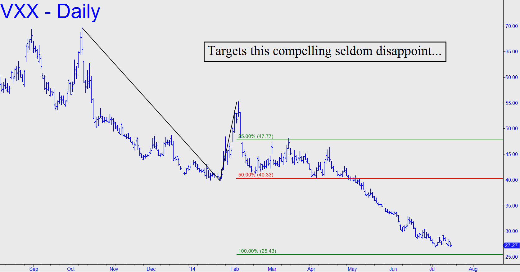 Targets as well-defined and compelling as the one shown rarely disappoint. What this implies is that S&P 500 volatility, which has been in a multi-year bear market, is about to reverse and move higher. If so, it is logical that the stock market will make an important top that is more or less coincident. Traders and investors should position accordingly. If VXX’s expected bounce from 25.43 is sharp because the broad averages have taken a steep dive that day, take it as a sign that a powerful correction, or possibly even a bear market, has begun, and that ‘buying the dip’ could therefore prove to be a dangerous strategy.