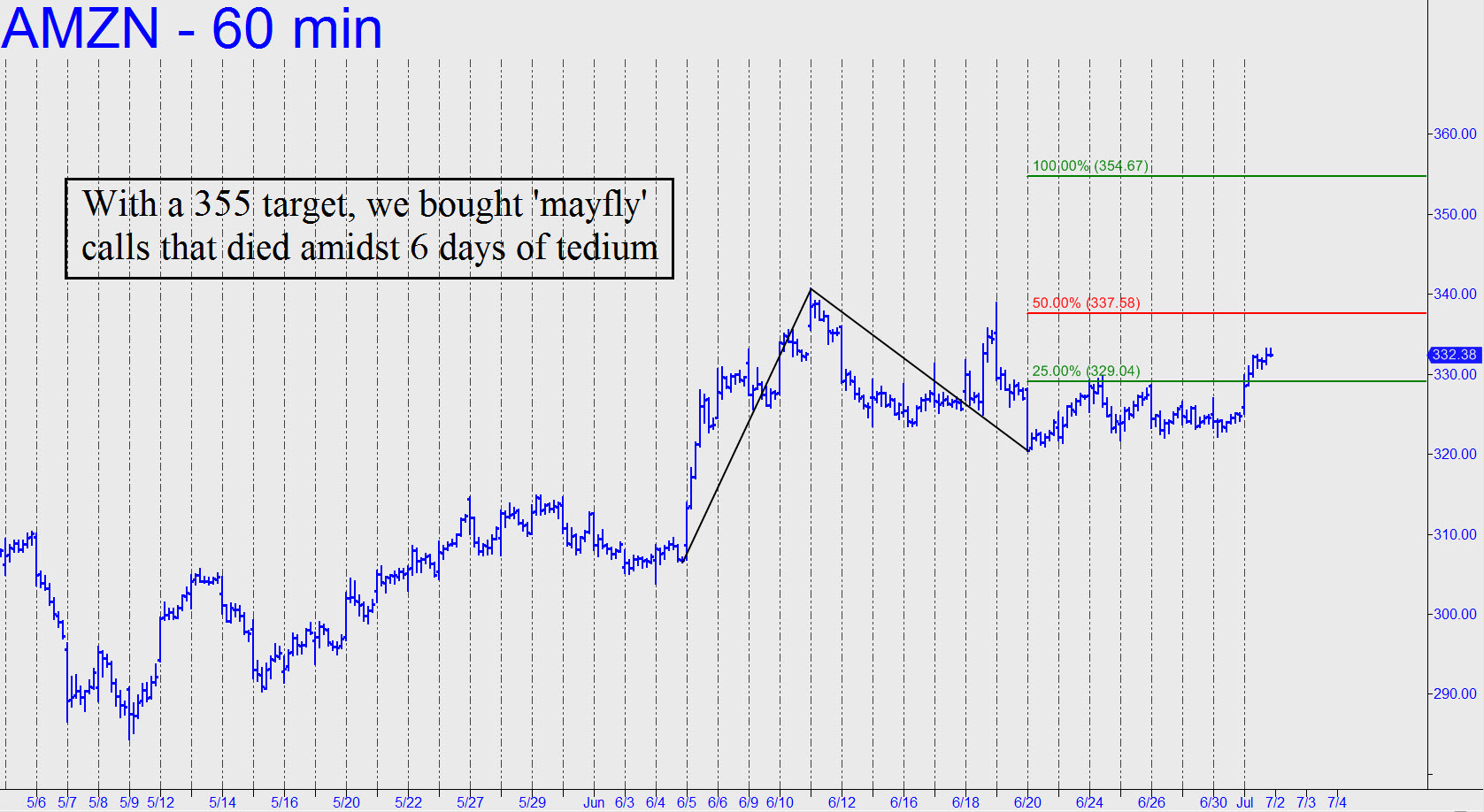 The 350-strike calls we hold for an average 0.47 expire tomorrow (Thursday) , and although they remain a distant longshot, yesterday’s $7.45 thrust at least gave them a fighting chance. I’ll suggest offering half of them for 0.60, day order, and saving the rest for Friday if AMZN finishes above 338. The chart is a reminder of what we were shooting for in the first place, and how much ground the stock must cover in just two days to put us in-the-money. _______ UPDATE: The stock finished out the week screwing the pooch, and so our calls went to zero. The loss was $188, assuming four held.