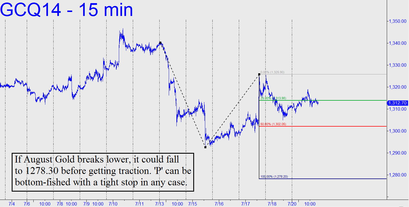 The futures looked like they could go either way as Monday’s session drew to a close. However, the stall within 0.70 of the 1318.30 midpoint resistance I’d flagged implies that a decisive move past it would reach its D-target sibling at 1331.60. Alternatively, my worst-case target for the near term would be the 1278.20 Hidden Pivot support in the lower-right quadrant of the chart — or possibly even 1271.70 if any lower. The accuracy of this target would be affirmed by a bounce, possibly tradable, from within two or three ticks of the 1302.00 midpoint support. ________ UPDATE (9:57 a.m. EDT): Gold has bounced $14 this morning from a low just two ticks (0.20) from the 1302.00 midpoint pivot flagged above. Now, if the futures breach the support, we’ll know EXACTLY where they are headed. _______ UPDATE (July 23, 12:01 a.m.): Someone in the chat room said that because everyone seems to be bearish on gold right now, perhaps we should take the other side of the bet. I’m a bit bearish myself, and thus this response: “Rather than take chances and let gold disappoint us for the zillionth time, we should simply stipulate that the August contract close above 1318.90 before we get excited. That’s the midpoint resistance, on the 180-minute chart, of a=1292.60 on 7/15; b= 1325.90 on 7/27; and c=13-02.20 on 7/22. At that point, I’d lay even odds of a move to at least 1335.50; above 1337.00, the futures would be a good bet to hit 1381.40. Whatever happens, bulls will have to prove their case. _______ UPDATE (July 24, 1:20 a.m.): Sellers paused for a relatively blissful nine hours yesterday just inches above the 1302.00 ‘hidden’ support I’d flagged, presumably to sniff the flowers before going back on the attack.