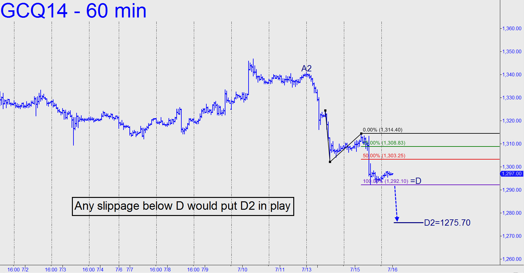 A very tedious and tiresome consolidation that has stretched into weeks has not altered the bullish look of the intraday charts. My immediate rally target has changed slightly, however, to 1374.00, a Hidden Pivot that should be considered well in play as a minimum short-term price objective once the futures push past the midpoint pivot at 1339.70. Night owls looking to get aboard should use a pullback from just above the 1333.20 peak recorded on July 2. _______ UPDATE (8:20 a.m. EDT): Bullion prices have in fact taken flight this morning. If you got aboard as advised, please let me know in the chat room so that I can establish a tracking position for the further guidance of subscribers. _______ UPDATE (10:13 p.m.): The so-far $10 correction off Thursday’s high will trip a new buy signal at 1340.75. If the futures run up just $5 from there, they would be signaling more upside to the 1354.70 target of a minor rally pattern subsumed by the larger one that still ponts to 1374.00.________ UPDATE (July 14, 10:50 a.m.): Gold has gotten whacked today, but you could search a billion web pages and not come up with a satisfying explanation as to why. We’ll chalk it up to ‘just one of those things’ and wait for improved price action. Although the $35 dive has negated the bullish targets given above, it did no damage whatsoever to a weekly chart that shows two bullish impulse legs of different degree: one starting from the New Year’s low, the other from the 1240.20 low recorded on June 6. ______ UPDATE (July 16, 1:10 a.m.): The futures bounced very precisely yesterday from the 1292.10 target shown (see inset), but the bounce wasn’t very robust, and if it goes just a smidgen further the 1275.70 target of the larger pattern starting with A2 would be in play. The usual precautions are advised if you plan to bottom-fish there.