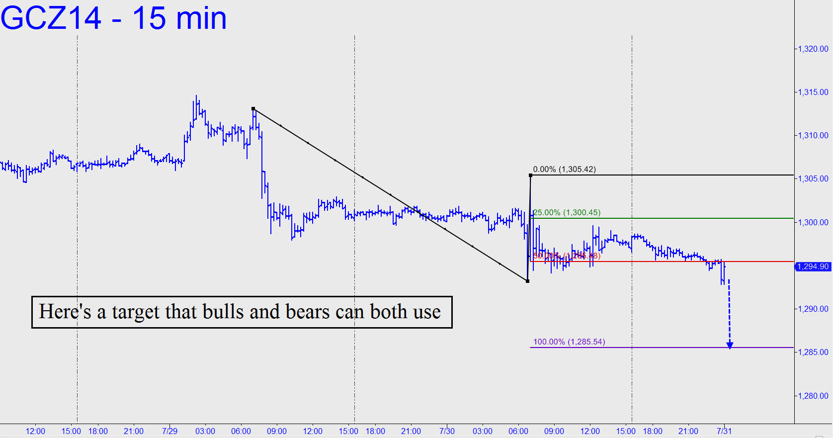 Lower targets given here yesterday remain viable, but a new one at 1285.50 has come into focus as a result of yesterday’s headless-chicken histrionics. Night owls can try to grab a piece of the downside by shorting near the 1296.40 midpoint pivot with a tight stop. But if you miss the trade there will be an opportunity to bottom-fish via a 1285.60 bid and the tightest stop-loss you can handle. _______ UPDATE (8:48 a.m. EDT): This one worked pretty nicely, since the futures swooned to a 1285.90 low just 15 minutes ago, then bounced to a so-far recovery high at 1291.20. As of 9:40, there were no reports in the chat room of anyone having used the target to get long, although one sub evidently was short profitaly overnight.