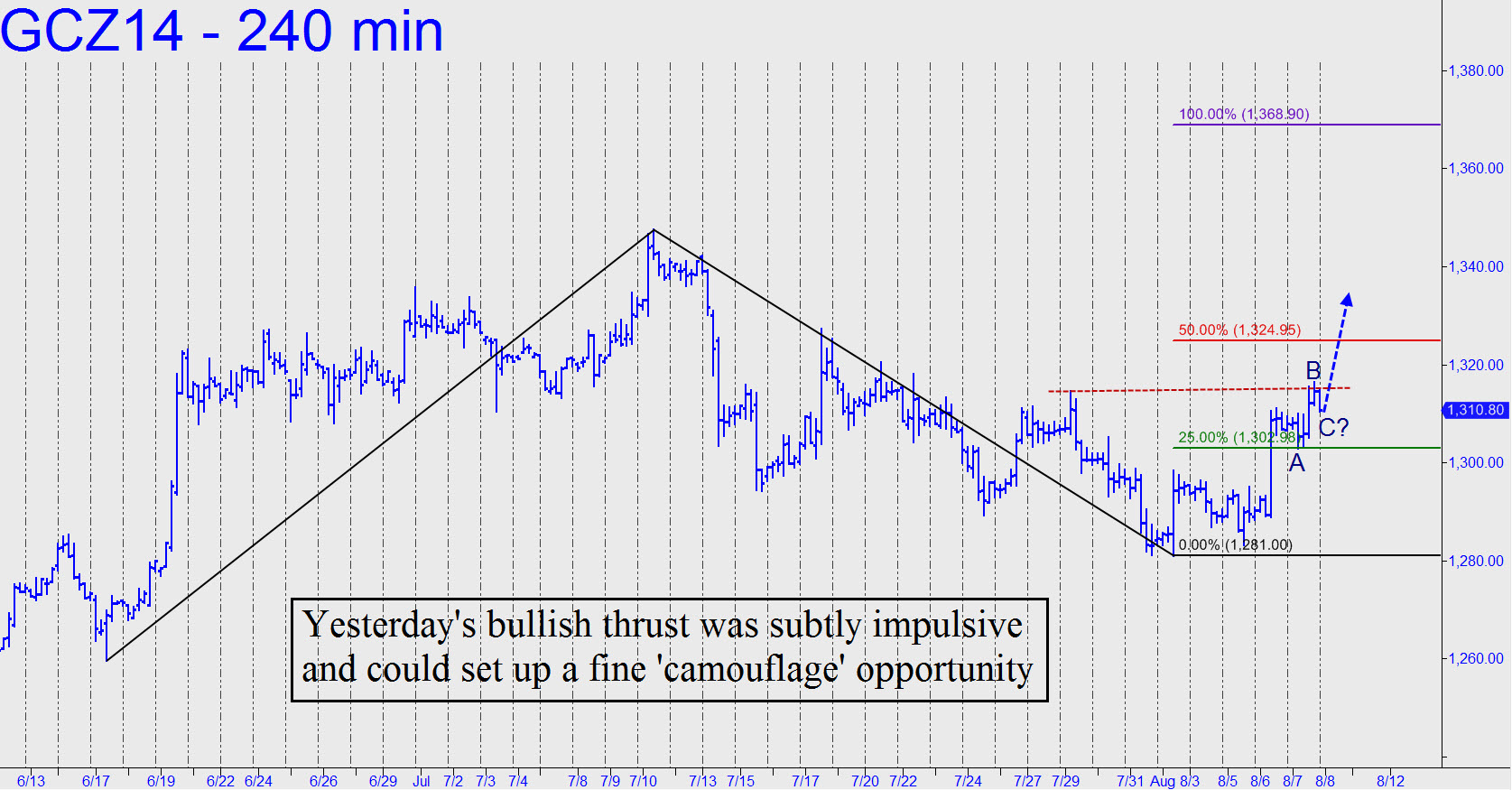 Yesterday’s follow-through rally was modest but encouraging, since it exceeded an important ‘external’ peak, refreshing the bullish energy of the intraday charts. Traders should notice that the rally also generated an A-B impulse leg that could lend itself to a camouflage-style long entry. There’s no point ‘C’ low to the pattern yet, but night owls should watch for one to develop, since it may yield a precise signal for this vehicle’s liftoff from the launching pad. It would be quite bullish if a rally settles above the 1325.00 midpoint pivot, since that would indicate more upside to 1368.90 over the near term.
