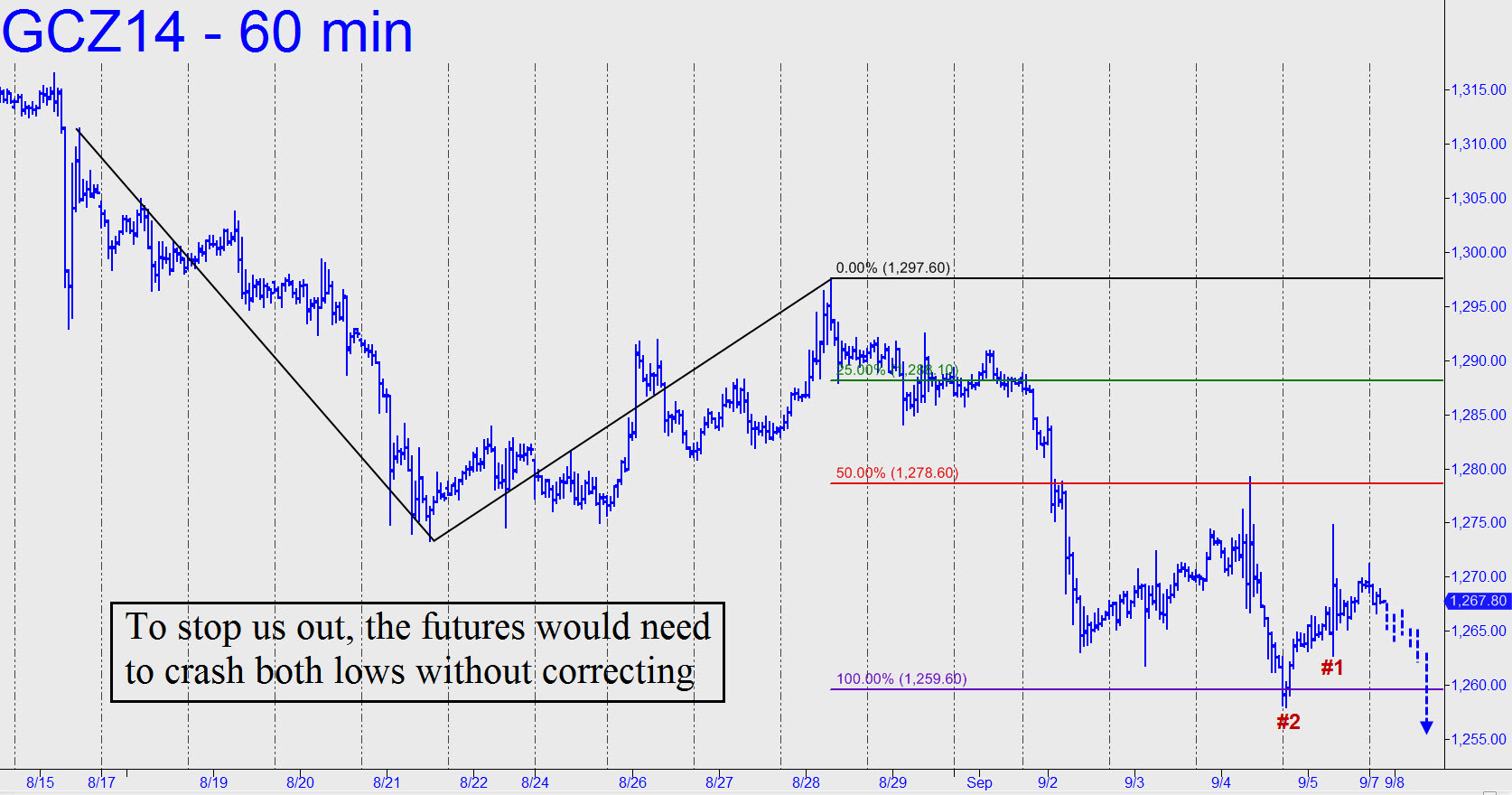 Several subscribers have reported using my 1257.80 correction target to get long near the low, so I’ve established a tracking position for your further guidance. Assuming half of the position was covered at 1270.00, we hold two contracts with a profit-adjusted cost basis of 1246.10 from an original position of four contracts. To manage risk dynamically, I’ll now suggest using an impulse leg stop-loss based on the hourly chart. This implies that the futures would have to breach the two lows shown, and to do so without a visually significant correction once low #1 is breached, to stop us out. If the stop is hit, brace for more downside to at least 1249.20. You can bottom-fish there with the usual microtight stop-loss, but don’t expect to hit a home run on the bounce. ______ UPDATE (2:01 p.m. EDT): Gold has relapsed to a so-far low of 1252.10 — not exactly a healthy sign. We exited on the stop at 1257.90 for a theoretical gain of $1,180 per contract. The 1249.20 pivot can still be bottom-fished nonetheless.
