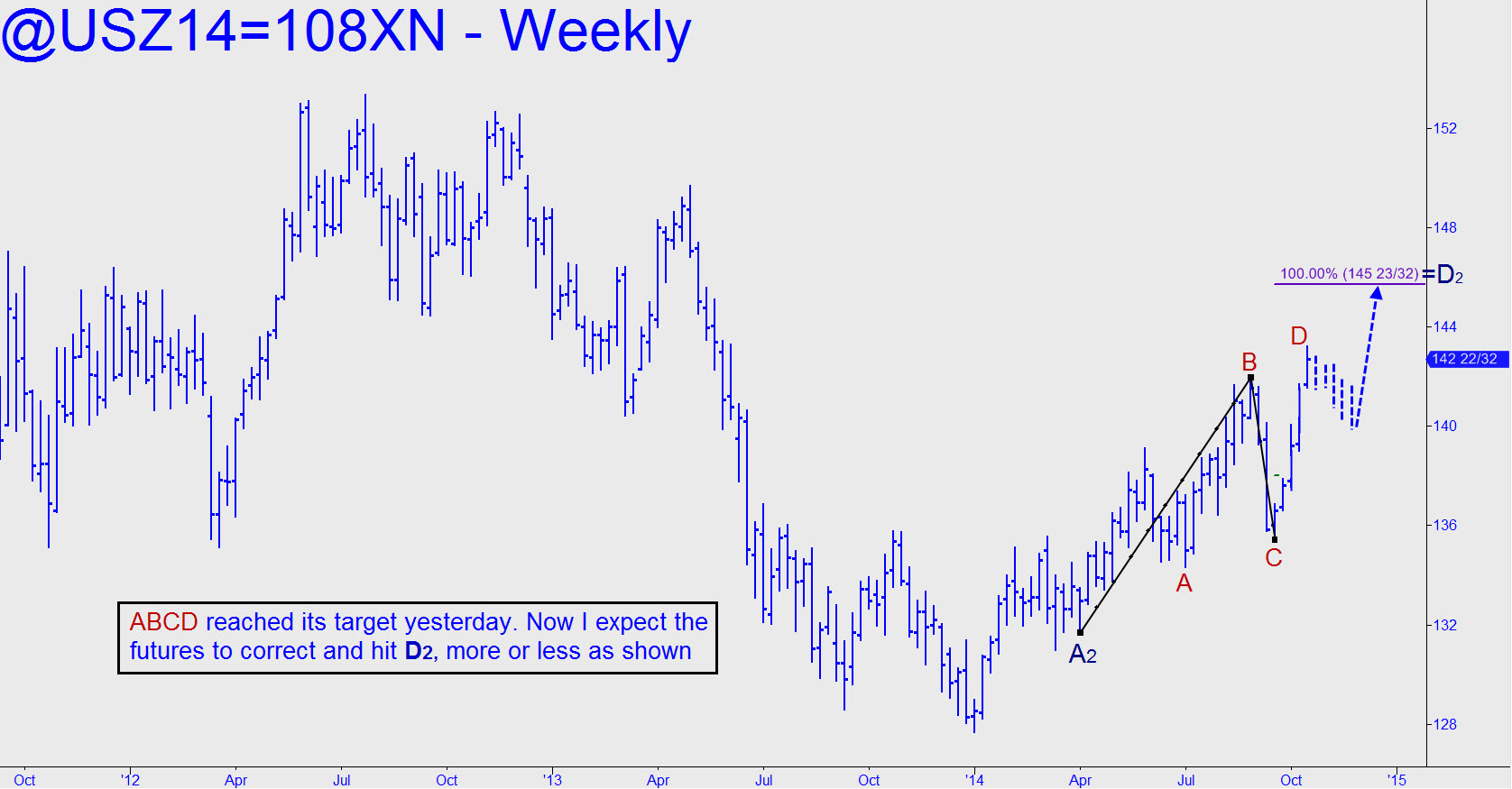 Yesterday’s rally impaled a 142^28 rally target that was achieved much more quickly than I had anticipated. The A-B impulsive phase of the rally took a little more than two months to complete, but the far steeper C-D leg took only half that. Moreover, the target was exceeded by a significant ten ticks, implying that bulls (and of course short-covering bears) may have more buying to do. Ordinarily I would look to get short here, given the persuasive and precise look of the pattern that produced the target. In this case, though, we’ll play it cautiously and sit out the creation of a possible top near these levels. Once the subsequent correction has run its course, we should expect the next rally cycle to carry to at least 145^23, the Hidden Pivot target shown as D2 (see inset, a continuous weekly chart . Regarding how quickly it might be reached, we’ll make no assumptions of a slowdown in this world-beater’s ascent. This will have implications for the way we position ourselves in TLT, where the expected widening of bullish calendar spreads we bought has been subdued because both sides of the spread have gone well in-the-money. _______ UPDATE (10:20 a.m. EDT): Bullish as I’ve been on T-Bonds, I could neither have imagined nor predicted the frightening power of today’s rally. Although the futures have sold off hard after spiking spectacularly in the early going, the rally has affirmed the flight-to-safety concept in spades. U.S. Bonds are where the world’s investors will turn when it’s time to circle the wagons. Incredibly, that day may be at hand. It is almost surreal that there’s at least a small possibility Ebola will turn out to be the Black Swan we’ve all dreaded for so long.