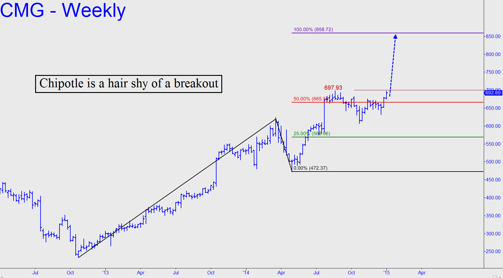 The ABC pattern that defines Chipotle’s bull market is so clear (see inset) that it leaves us with but one choice of major targets: 858.72. That would represent a 24% gain from these levels, a fact that probably explains why the stock has been taking its sweet old time consolidating near the 665 midpoint Hidden Pivot. Notice that CMG is just a hair shy of breaking out above August’s all-time high at 697.93. It’s not the breakout per se that we should care about, but the nature of any pullback that occurs from above it, since the implied ABC pattern could conceivably be tradable with relatively little risk. We don’t need to wait for this to happen on the weekly chart, however, since a 697.94 print even on the 5-minute chart would in theory give us a tradable pattern to work with. Getting long in this way could be tricky, so don’t hesitate to ask me in the chat room for real-time guidance if CMG should exceed the August peak.
