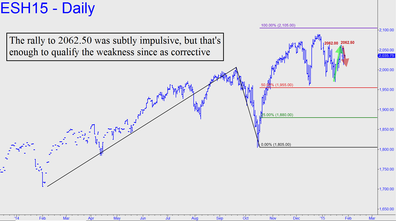 Yesterday’s selloff, nasty as it seemed, was just the correction of a subtle, bullish impulse leg generated last Friday on the daily chart. Notice that the intraday high exceeded a peak made two weeks earlier by 0.50 points (two ticks). It’s a subtle impulse leg, to be sure, but it needn’t have been any more obvious or robust to qualify the weakness of the last three days as merely corrective. All of which implies that our longstanding target at 2105.00 is still very much in play. Its attainment would represent only a marginal new all-time high, but we’ll short there aggressively anyway, since it is just the kind of place where bulls could get trapped worse than Gen. Custer.