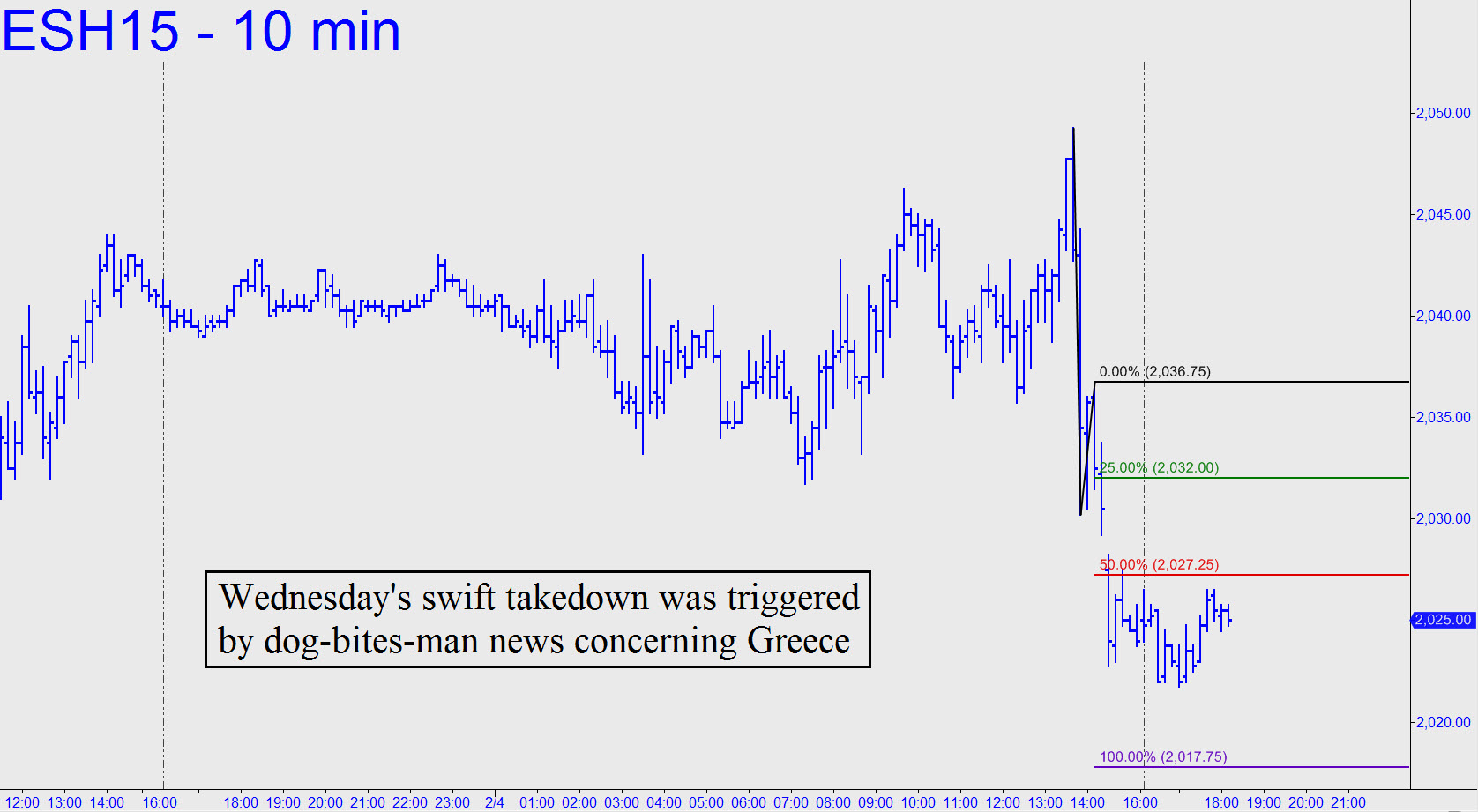 There’s no such thing as a market too crazy to day-trade, but this one is getting close. I put out a 2048.75 rally target in the chat room yesterday afternoon with the futures trading about six points lower. Several subscribers jumped on it and thanked me a few minutes later when the E-Minis popped to 2049.25. But even before we’d finished high-fiving each other, the futures plunged in a mere minute to 2030.25, on their way to a so-far low Wednesday night of 2021.75. (Note: My downside target then, and now, is 2017.75. It can be bottom-fished overnight with a tight stop-loss.)