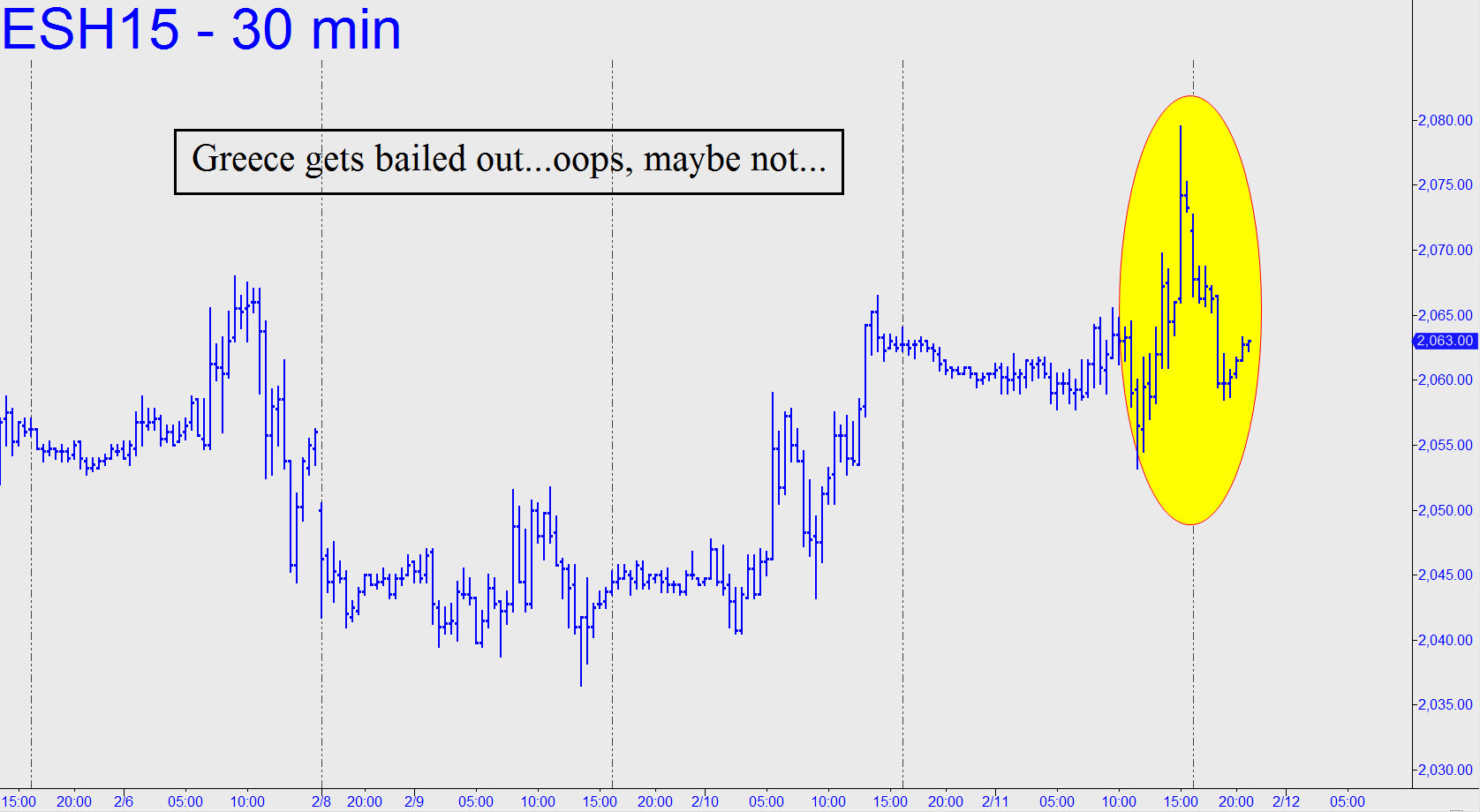 Conflicting news about Greece drove index futures batty for a while Wednesday evening. Immediately after the day-session close, the E-Mini S&Ps took off on mistaken news that Greece had accepted Germany’s bailout terms. The ensuing 18-point rally spiked to 2079.50, just inches from the 2081.25 target we’d been using for the last couple of days. Armed with that Hidden Pivot, a dead-eyed subscriber in the chat room reported getting short at the top, calling it “the quickest buck I have ever made”. The plunge he was able to leverage was good for a 20-point ride, but the futures have bounced a little since, even though it is now official that Greece and Europe still don’t have a deal. Will we be able to stand the suspense until Monday, when the talks resume? Since we have higher targets outstanding, my hunch is that something that at least looks and quacks like a deal will be announced next week. Greece and Wall Street may celebrate the announcement if and when it comes, but we shouldn’t kid ourselves that whatever has transpired will allow Greece to come off the respirator. In fact, and as we well know, nothing of substance will have changed.