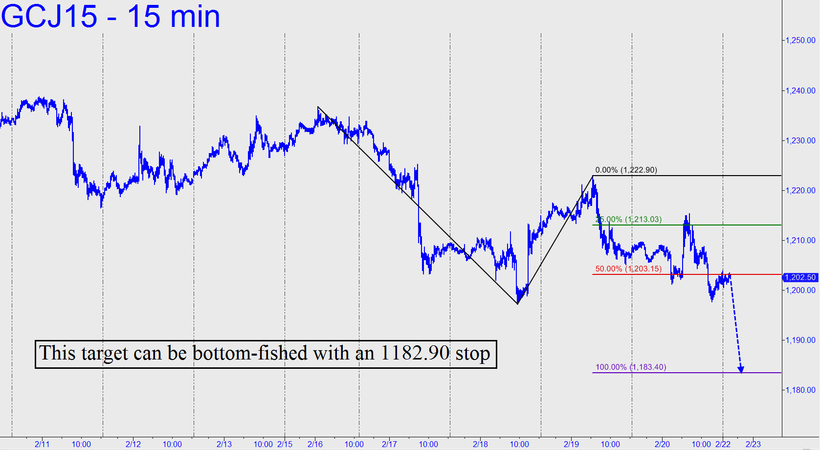 We’ve been using an 1187.60 target to keep a step ahead of the bear, but the 1183.40 Hidden Pivot shown looks more compelling at this point. Accordingly, I’ll recommend bottom-fishing with an 1182.90 stop-loss, but only if you’ve held a short position on the way down. Camouflage is the suggested method of getting short, but if you prefer the simplicity of a ‘mechanical’ entry, offer at 1203.20, stop 1208.80, making the stop-loss o-c-o with a bid to cover the position at 1184.00. Optionally, you could try bottom-fishing at 1187.60 with a stop-loss as tight as 4 ticks. Please report any fills in the chat room so that I can establish a tracking position for your further guidance. _______ UPDATE (Monday morning): Getting short at 1203.20 as suggested could have produced a gain per contract of as much as $1400, since the futures fell to 1190.60 overnight. A stop-loss as tight as $1.60 would have sufficed, since the futures went no higher overnight than 1204.70.