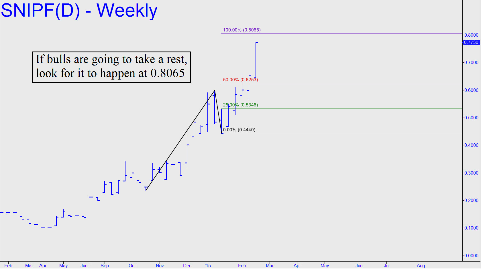 Those who already own the stock would not have failed to notice that a “bought sale” underwritten by Canaccord and completed just days ago will significantly dilute shareholder equity. The deal originally sought to raise $8M, but the amount was increased to $12M ( @ 0.55 CDN per share) to accommodate unexpectedly strong demand. The sale appears to have slowed SNIPF’s steep rise on the charts (see inset), but my gut feeling is that this will be temporary and that the ultimate impact will be highly beneficial to shareholders. Give a lean, aggressive upstart and innovator like Snipp $12 million to grow, and they will do so — as efficiently as any investor could hope for. _______ UPDATE (February 17, 5:25 p.m. EST): The stock took a powerful leap today on Canadian volume of 2.1 million shares — most impressive. The percentage gain was 13.41% CDN, or 18% in U.S. dollars. From a technical standpoint, the OTC stock is due to meet daunting Hidden Pivot resistance at exactly 0.8065, equivalent to around 0.98 CDN (see inset, a fresh chart). I expect a sharp pullback from that price, but if SNIPF simply blows past it, that would imply there are still plenty of investors eager to jump aboard, even at these nosebleed heights. _______ UPDATE (February 18, 5:05 p.m.): The stock popped once again after taking a modest hit in the early going. The high on Canada’s Venture Exchange was 0.99, and although the O-T-C price in the U.S. seems to have remained at 0.77, the 0.8065 target should be considered filled. Now let’s see whether the target, clear and compelling as it is, marks at least a temporary top._______ UPDATE (March 6, 12:16 a.m.): The 0.8065 target has turned out to have been an important one, generating a correction so far of nearly 25%. Now let’s see if the 0.5823 target of this correction contains the pullback. _______ UPDATE (March 9, 10:51 p.m. EDT): The target was exceeded, so far by 4 cents, suggesting the correction has farther to go. Alternatively, a pop to 0.62 would be most encouraging.