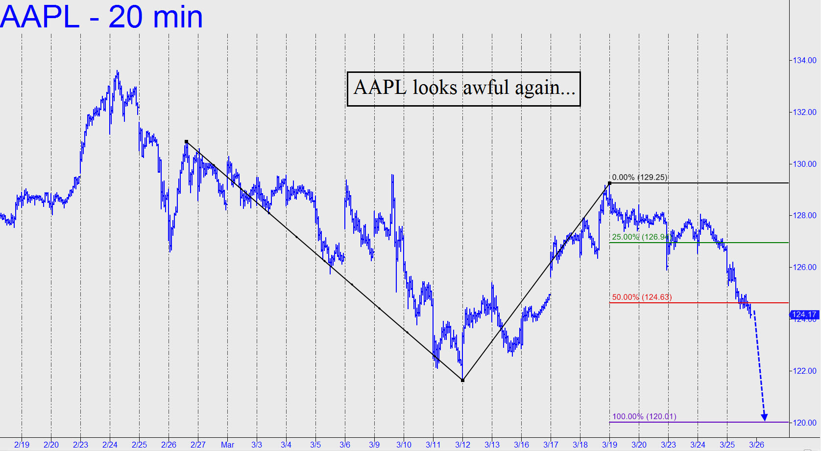I’ve featured Apple as the sleazy-stock-of-the-hour at the top of the home page (Ever Been Ripped Off by Wall Street?) , but that doesn’t mean we can’t try to trade the little s.o.b. Most immediately, the gnarly pattern shown holds promise for bottom-fishing because of two Hidden Pivot supports at, respectively, 126.58 and 125.33. The lower number looks like a no-brainer to me, so I’ll suggest bidding for 200 shares there, stop 125.19. Since there’s a chance the stock will turn higher from 126.58, you can try bottom-fishing there as well, but only if you’re comfortable using the camouflage technique. Please don’t hesitate to query me about this if I’m in the chat room if and when 126.58 is hit. _______ UPDATE (March 24, 12:26 a.m. EDT): Apple opened on a bearish gap at 126.56, exactly two cents from my target. Because some subscribers reported having bought stock there, I am establishing a tracking position for your further guidance. Assuming 400 shares bought for 126.58, with half exited at 127.69 (see my chat room post at 11:27 p.m.), we now hold 200 shares with a profit-adjusted cost basis of 125.47. For now, use an impulse leg-based stop-loss on the 5-minute chart. At the moment, that would imply exiting the remainder of the position on an uncorrected fall exceeding the 126.86 low recorded this morning at 10:00 a.m. _______ UPDATE (March 25, 3:03 p.m.): Subscribers should have exited the position near 126.85 for a profit of about $280. The stock looks awful once again, bound for as low as 120.01, based on the pattern shown.
