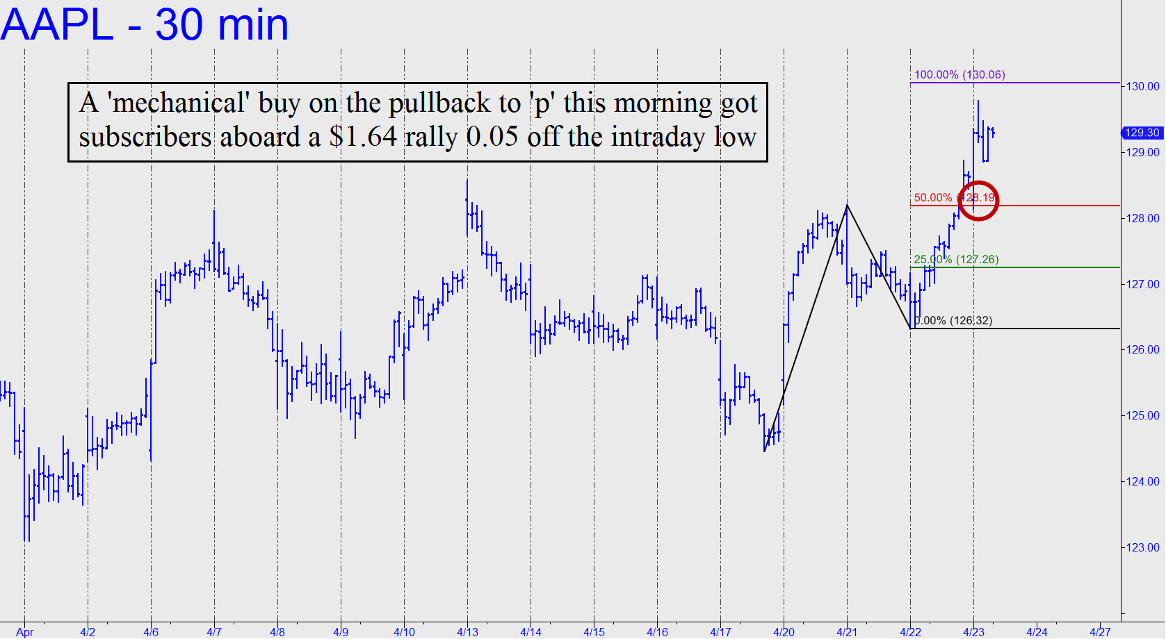 Buyers got sandbagged on the opening bar, paying as much as 128.20 for shares that would sell minutes later for a dollar less. The stock went still lower intraday, bottoming at 126.67 about 80 minutes into the session. This sort of price manipulation is carnival midway stuff, and it suggests AAPL will have to go even lower for DaBoyz to stock up on shares at distress prices before they run it up again. At day’s end, sellers were playing toe-sies with the 126.74 midpoint support of the pattern shown. If and when it gives way, expect the stock to fall to exactly 125.97. There are two good ways to short it, so stay close to the chat room if you want some real-time guidance. ______ UPDATE (8:52 p.m.): DaBoyz faked higher, then lower, on the opening bar to spring-load yesterday’s impressive short squeeze. It points most immediately to 130.06, and traders may be able to board belatedly on a pullback to p=128.19 (where, on the 30-minute chart, A=234.46 on 4/17). 130.06-128.19. A 127.56 stop-loss would apply. _______ UPDATE (10:42 a.m.): The 128.19 correction target flagged above nailed the low of this morning’s swoon within a nickel (see inset, a new chart). The stock subsequently rallied to a so-far high of 129.78. Since several subscribers reported doing this ‘mechanical’ trade, I’ll track 400 shares. Assuming a partial profit at 129.40 leaves us with 200 shares whose adjusted cost basis is 126.98. Do nothing further for now. Earnings are due out, and we’ll swing for the fences. Additional note: My bull market target for the stock, six years in coming thus far, is 143.97