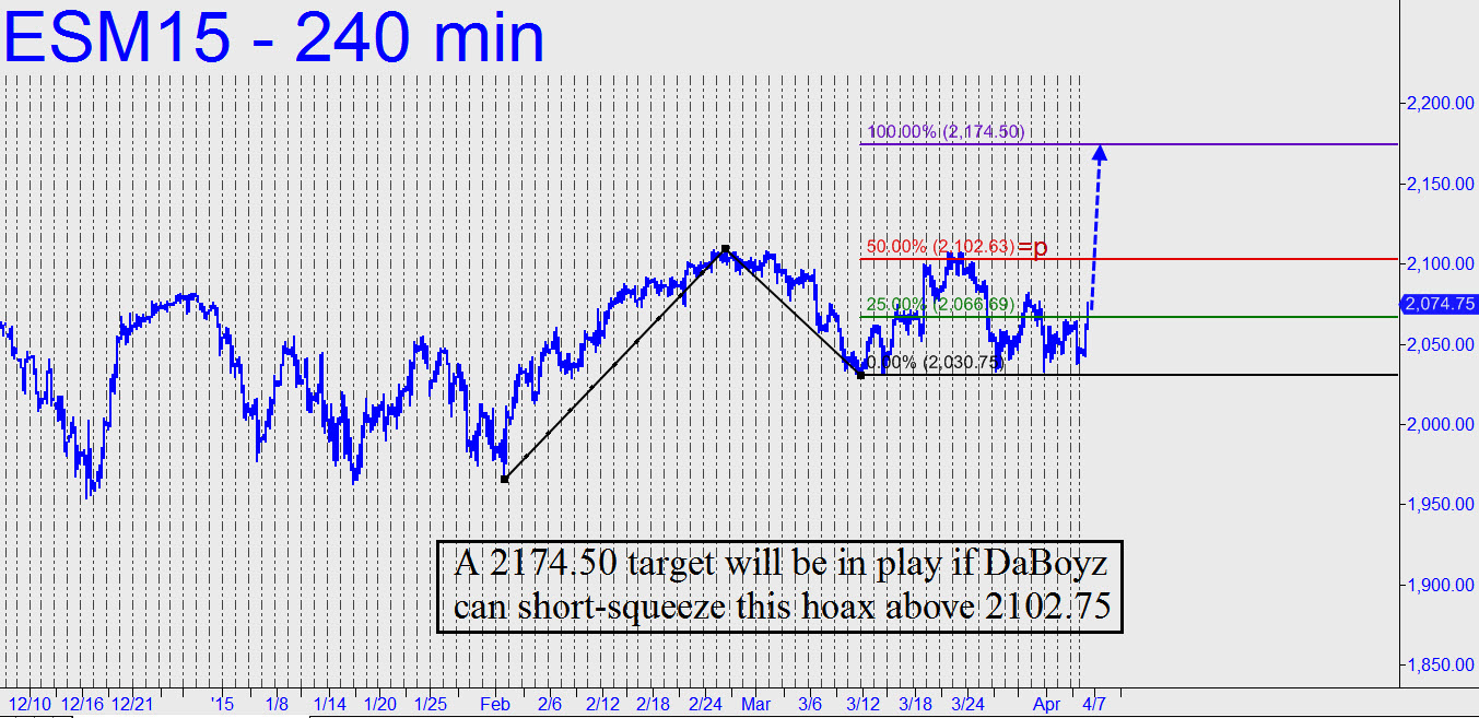 A trader’s head could spin trying to make sense of Friday’s fleeting plunge. Dismal payroll data was released on a holiday when most markets were closed, but that evidently didn’t stop a privileged few institutional scumballs from unloading index futures two days ahead of the crowd. Electronic trading went on for about 45 minutes after news was released that America’s on-again, off-again economic recovery had generated a paltry 126,000 jobs in March — the fewest since 2013. S&P futures plunged 1% in the 45 minutes that traders were allotted to get a jump start on the herd. Ordinarily, the dirtballs’ goal would be to exhaust supply on bad news by dropping their bids to levels that would be bargains even if the world were about to end. This time, however, it seemed there was unfinished business at the bell — i.e., more selling to do in order to fully discount the awfulness of the payroll news.