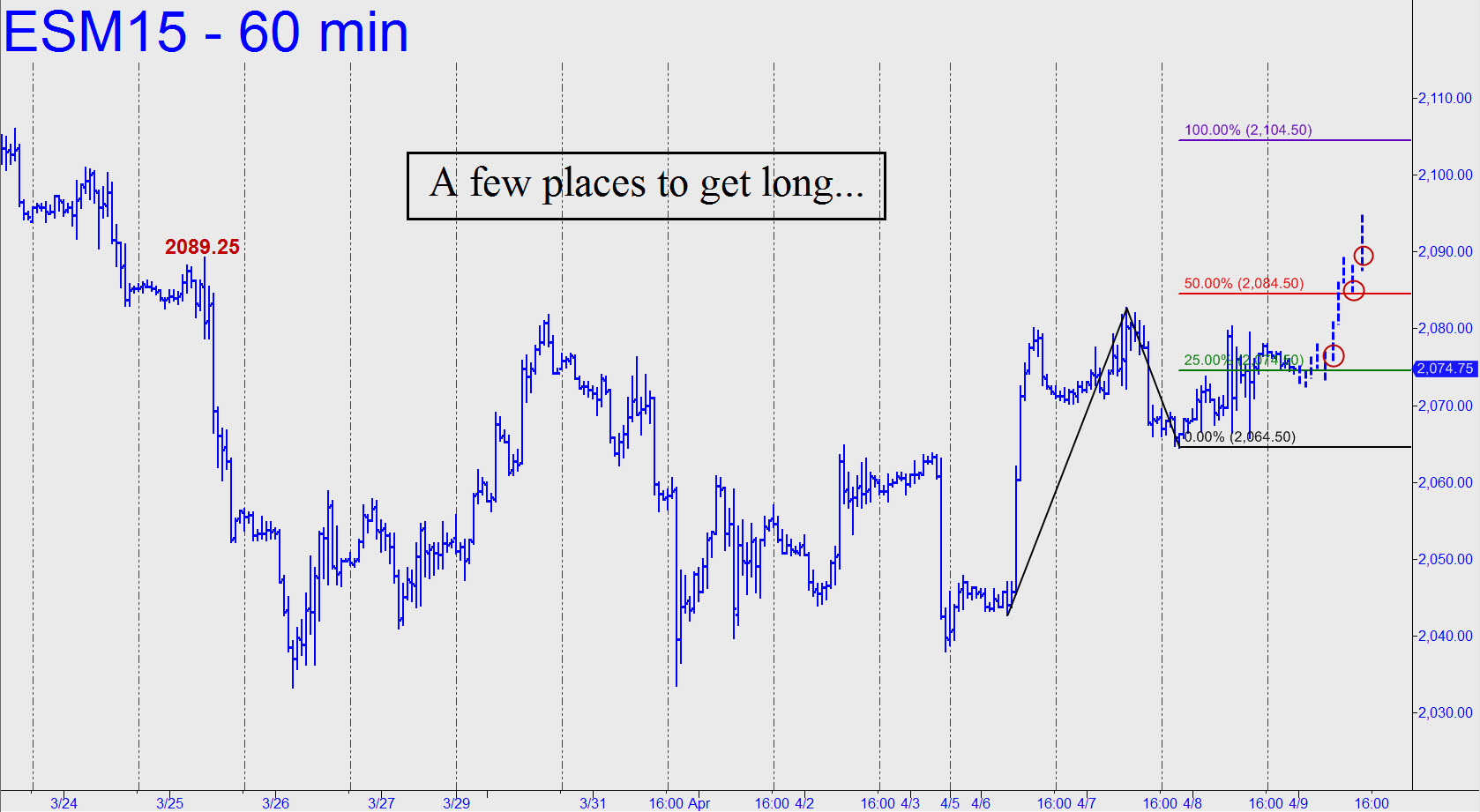 Yesterday’s headless-chicken hysterics left a rather clear rally pattern projecting to 2104.50. If the futures exceed p=2084.50 by 3.00 points or more, a pullback to p could be bought ‘mechanically ‘ with a 2077.75 stop-loss. Far less risky would be a camouflage entry keyed to the ‘external’ peak at 2089.25 recorded on 3/25. Night owls could get ahead of this trade by using the 3-minute chart to enter closer to x=2074.50 of the big pattern shown. ______ UPDATE (6:35 p.m.): No change, although night owls may have noticed that the futures closed above p=2084.50. There’s still 20 points of upside left to the original 2104.50 target, a fact that should provide a strong incentive to get aboard in after-hours trading. Two ways to do so are discussed above.