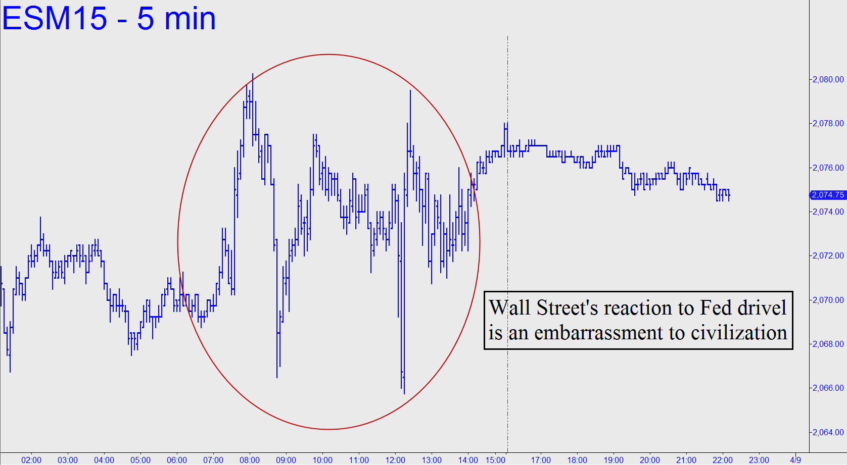 I’ve tuned out Fed announcements so completely that I don’t even know what day they’re coming, let alone what the Masters of the Universe may have announced. Granted, each nauseating new piece of drivel from Yellen & Co. tends to move the markets. But as I could easily demonstrate to you, the moves are almost invariably contained by Hidden Pivot targets above and/or below pre-announcement levels. Although this can spell opportunity for traders, the hysterical price swings are so miserably stupid that they amount to a civilizational embarrassment. I can’t bring myself to watch, nor can I stomach the news media’s diligent and respectful attention to Fed puke-speak. Let me repeat this prediction for the umpteenth time: The Fed will NEVER raise rates.