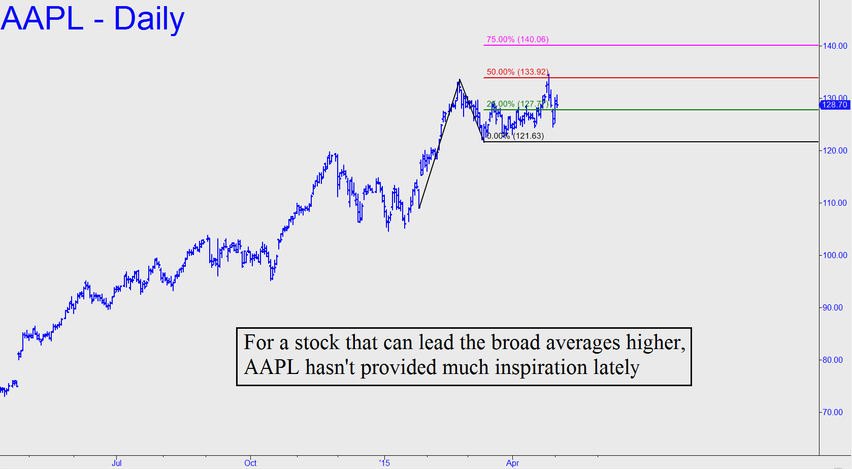 The World’s Most Valuable Stock has been inching toward our bull-market price objectives at a funereal pace. For quite a while, we’ve been using a target at 143.97, but we might just as well fixate on the somewhat more modest one at 140.06 that is shown in the chart. The pattern that produced it has been loosely confirmed by the spike to within an inch of its 133.92 midpoint pivot. Notice that the nasty selloff that followed did not breach any prior lows. That tells us that even when AAPL is having a really bad week, bears still can’t put it away. The stock appears bound most immediately for 134.66, but there could be a struggle first around 129.62, the midpoint pivot. We should pay close attention in any event, since this stock is the most important bellwether of them all. _______ UPDATE (May 5, 2:17 p.m.): With AAPL getting pasted today, down $2.80 at the so-far low, the S&Ps are off 20 points and the Dow a relatively modest 100 points.