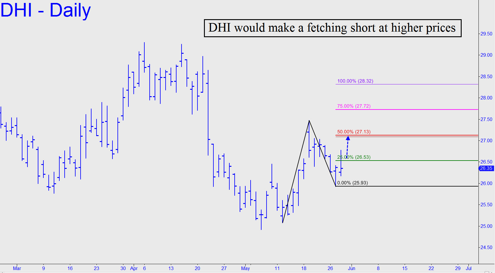 We’ve been keen on shorting this drecker for weeks but held off because the stock looked due for a bounce. That is in fact what has occurred, and the manner of it has provided some precise price points for getting short. Most immediately, there is the 27.13 midpoint pivot of the pattern shown. I’ve set a screen alert to warn me when it is closely approached, and I will provide a suitable strategy using put options if the opportunity should arise. That pivot can also serve as a minimum upside objective for the near term, implying the stock is a bull trade for the time being.