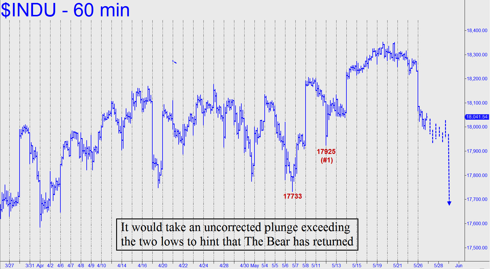 Refreshing as yesterday’s dive may have seemed, it failed to tip the big picture in favor of bears. They could take encouragement on a further decline surpassing 17733, but keep in mind that the move would need to be uncorrected on the hourly chart once the first external low, 17925, is breached. Regardless, because the recent top occurred near a major Hidden Pivot rally target (see today’s E-Mini S&P tout for further corroboration), we should remain open-minded to the possibility that a very significant decline is under way.