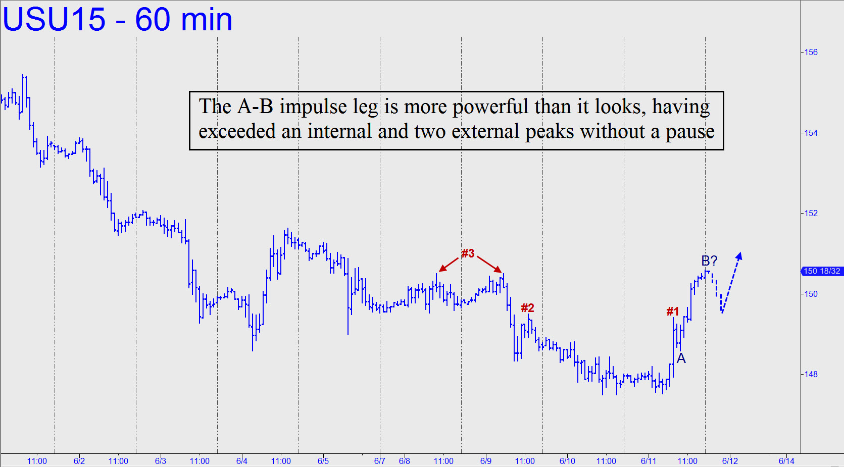 Yesterday’s powerful rally came off a low just four ticks from the 147^21 Hidden Pivot target where I’d suggested bottom-fishing. Since no one mentioned having done so in the chat room, I have not established a tracking position. Be that as it may, at the closing bell the rally was a couple of ticks shy of exceeding a key ‘external’ peak at 150^16 from Tuesday. Early Thursday evening, however, the futures surpassed the peak, suggesting that the rally is even stronger than it initially appeared. Indeed, it has now exceeded two ‘external’ peaks without a pullback on the hourly chart (see inset), making a follow-through leg very likely. In the meantime, the futures could conceivably push past even more external peaks before they retrace, adding to the imputed strength of the impulse leg. Once the up-leg terminates with a point ‘B’ high, traders can use a pattern like the one shown to get long, presumably on a chart of lesser degree. _______ UPDATE (12:08 a.m. EDT): With no remedy in sight for Greece’s problems, and time running out to fashion a deal that could be sold as constructive, U.S. Treasury paper should continue to appreciate in the days and week ahead.