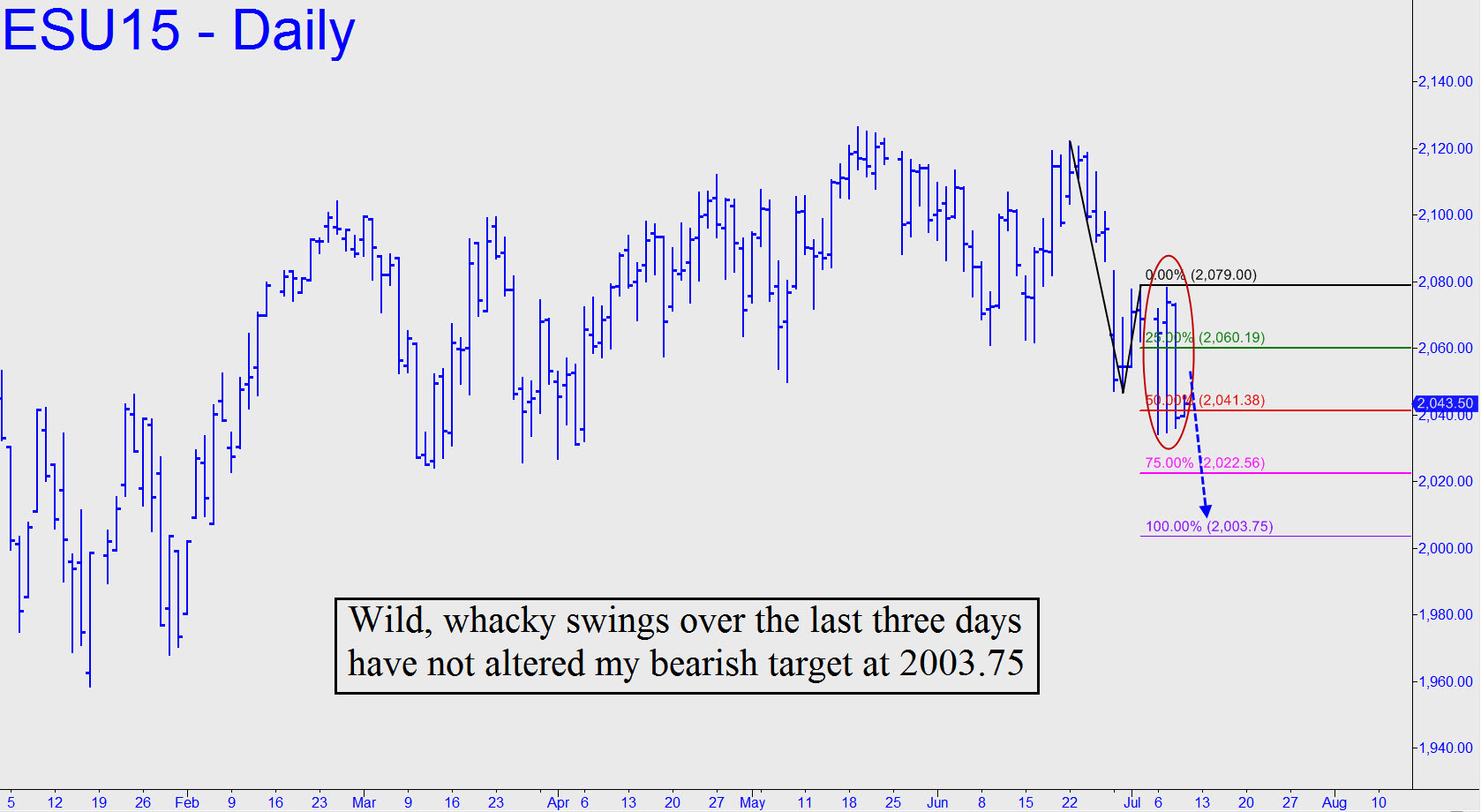 Easy money aside, what does yesterday’s selloff portend? My guess is that the 2003.75 downside target first broached here a couple of days ago will be achieved. If so, it would mean the Dow has a further 300 points to fall before the bear cycle begun from 2122.00 on June 22 has run its course. If a pattern that has become entrenched during the last two months or so continues, the best opportunity to get short will come at around 4 a.m. Eastern, when “no one” is around. As night owls will have noticed, index futures have been making their daily highs or lows in the dead of night, since that is when the futures are most easily manipulated. Off-session trader looking to leverage this insight should take note of a so-far unused Hidden Pivot at 2022.50 (see inset), since it could generate a tradable reversal either tonight or, more likely, shortly after the opening bell.