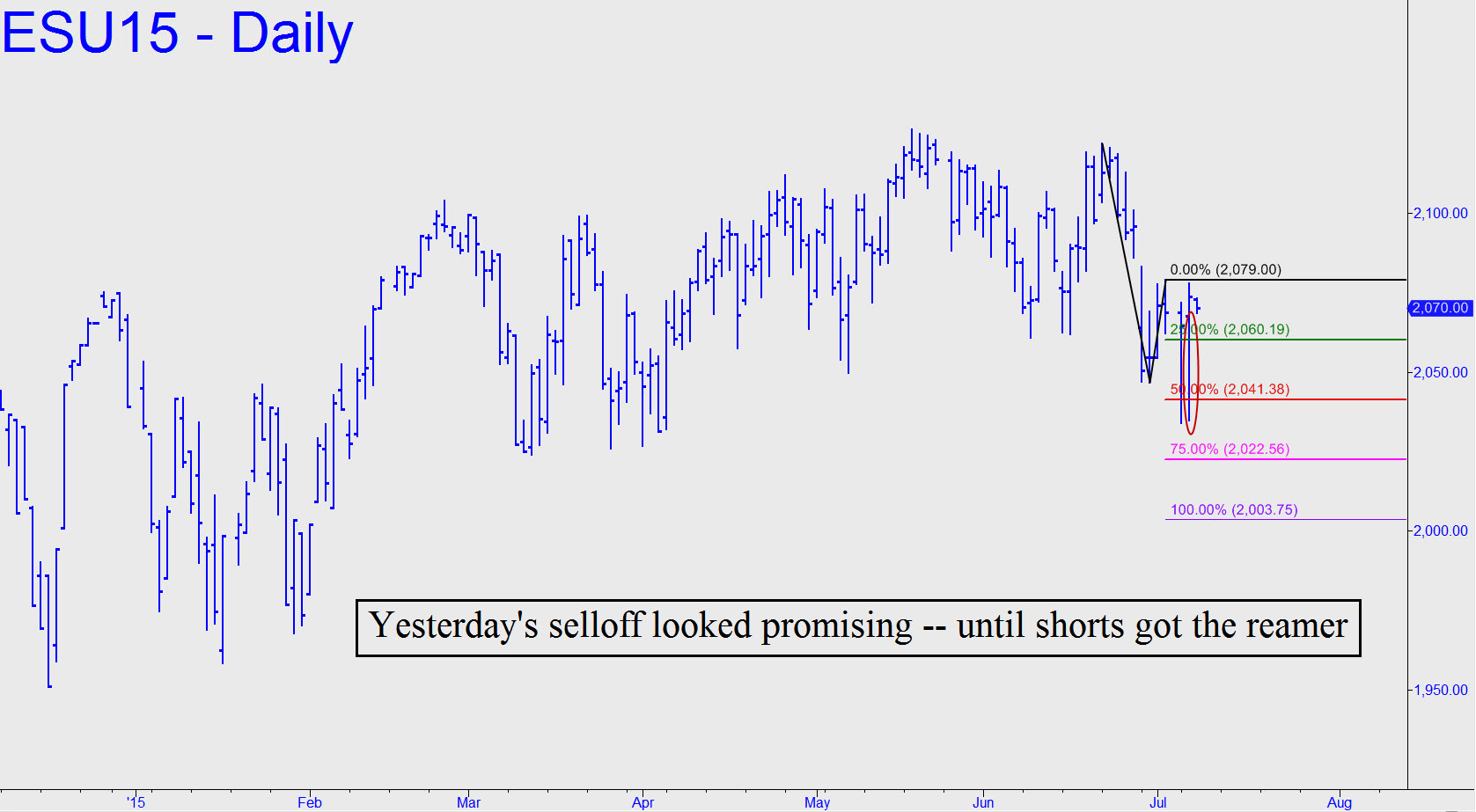 The futures ended June with a robustly bearish impulse leg, but the nasty follow-through we might have expected in July has unaccountably been held in check. It seemed to be unfolding in earnest after the opening yesterday, with the futures eating away at a sturdy midpoint support at 2041.25 (see inset). After breaching this Hidden Pivot by a decisive six points, however, they whipped around and finished higher on the day. Now, although the target a 2003.75 and a lesser one at 2022.50 remain valid in the event of a selloff, my hunch is that bears have grown too frustrated and fearful to try a takedown. On balance, I’d still look for lower prices into week’s end, but my hunch is that they will come only with a lot of herky-jerky action. _______ UPDATE (10:26 a.m. EDT): The futures have been down as much as 30 points this morning — meaningless movement, since the high and low both lie within yesterday’s even more gratuitously expansive range.