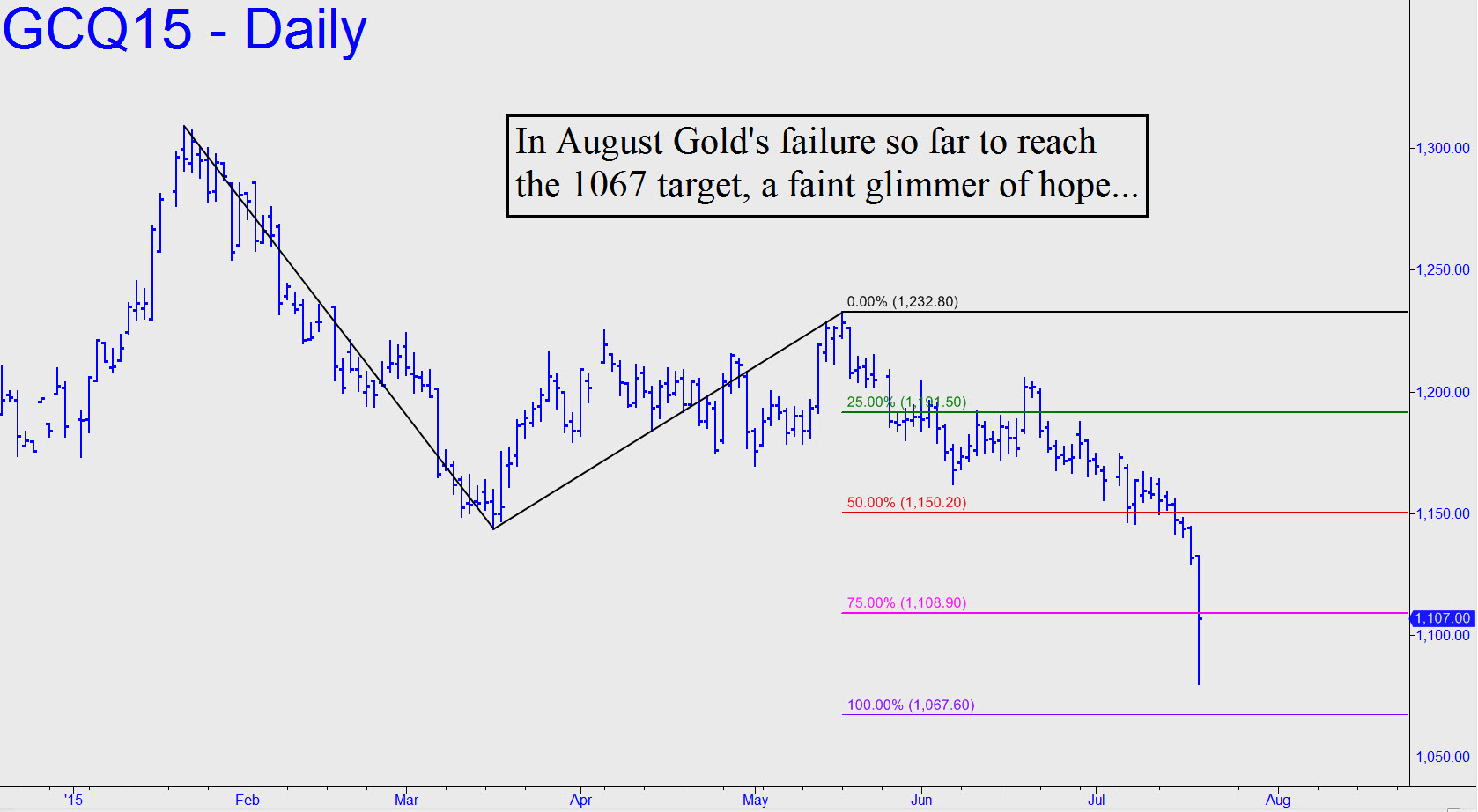 Sellers effortlessly demolished the sturdy-looking Hidden Pivot support at 1135.00 that we’d been using as a minimum downside target. This augurs more weakness over the near term, presumably to the 1125.20 target shown. (I moved ‘A’ up to the next peak to come up with this target.) A tradable bounce is very likely, since, as you may recall, it coincides with a very major Hidden Pivot support that comes from the monthly chart. I’ve drum-rolled that target before, since its decisive breach would portend more slippage to a least 971.30, and possibly to 817.50, the number I’ve used as a worst-case low for the bear market begun in the fall of 2011. ______ UPDATE (July 20, 12:10 a.m. EDT): It is late Sunday night, and gold futures are falling like a brick. In the process, they have continued to trash significant Hidden Pivot supports with the greatest of ease, suggesting that sellers are not yet done. Among the supports demolished was a major one at 1125.20 that I’ve been drum-rolling for months. (Note: This is not the 1125.20 pivot identified above, which is a coincident target of a downtrend of much smaller degree.) Because 1125.20 has been decisively exceeded, my minimum downside target is now the pivot mentioned above, 971.30. If you’re looking for a glimmer of hope, it would lie in the fact that Sunday night’s crushing selloff has rebounded from a low that did not quite achieve the 1067.60 target shown. Although the target will remain theoretically viable unless 1232.80 is exceeded to the upside, it would take a print today at 1146.80 to even hint that anything so encouraging is likely.