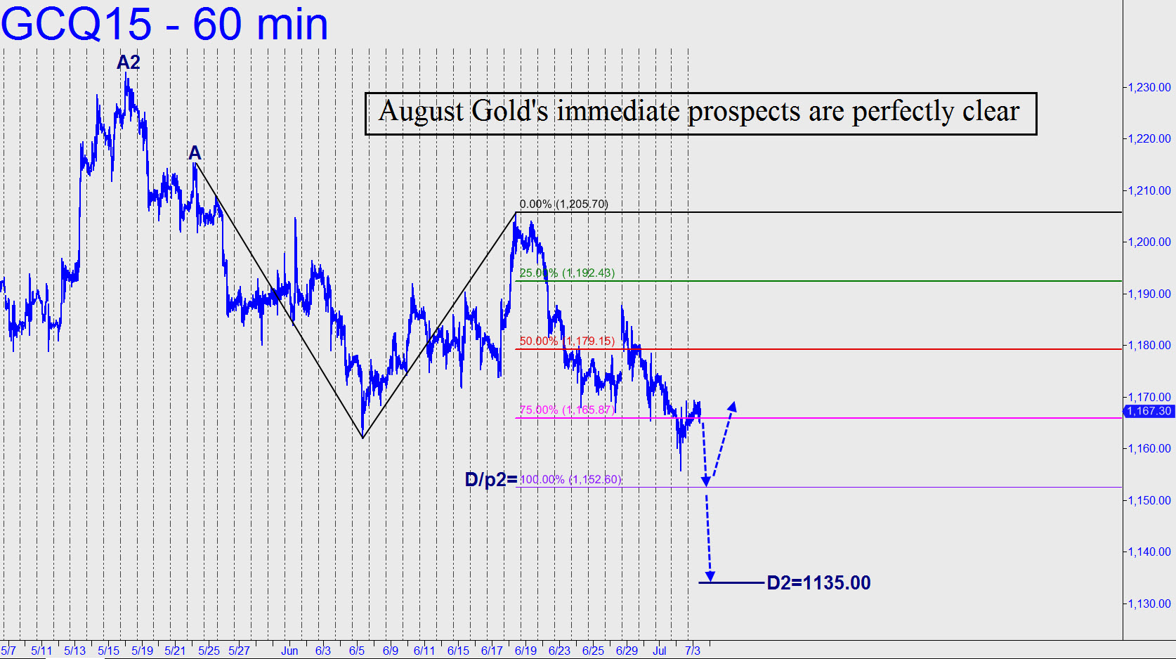Gold’s bearish chart (see inset) would appear to conflict with reports that Greek voters have roundly rejected austerity measures demanded by their creditors. The chart shows downside targets at 1152.60 and 1135.00, but if Greeks have in fact voted down the referendum, we might expect gold prices to be buoyant when trading resumes Sunday evening. However, considering the feebleness of the initial rally in gold a week ago, when it became clear that Greece would default, we shouldn’t get our expectations too high. The hourly chart is tortuous and unclear, but I’d say any knee-jerk pop in this vehicle would hit 1173.10, just $6 above the most recent settlement. Beware of a relapse! ______ UPDATE (July 6, 10:39 p.m. EDT): The futures have bounced from 1155.80, but not by enough to change the targets given above. Keep them in mind unless buyers exceed 1188.00 today or tomorrow, since that would be short-term bullish. _______ UPDATE (July 7, 9:20 a.m.): A plunge this morning has brought August Gold down to a so-far low of 1153.60, just $1.00 from the target I’d furnished above. If and when this Hidden Pivot support fails, look for more slippage to the second target, 1135.00. Meanwhile, if you used my number to get long near the low, take a partial profit here.