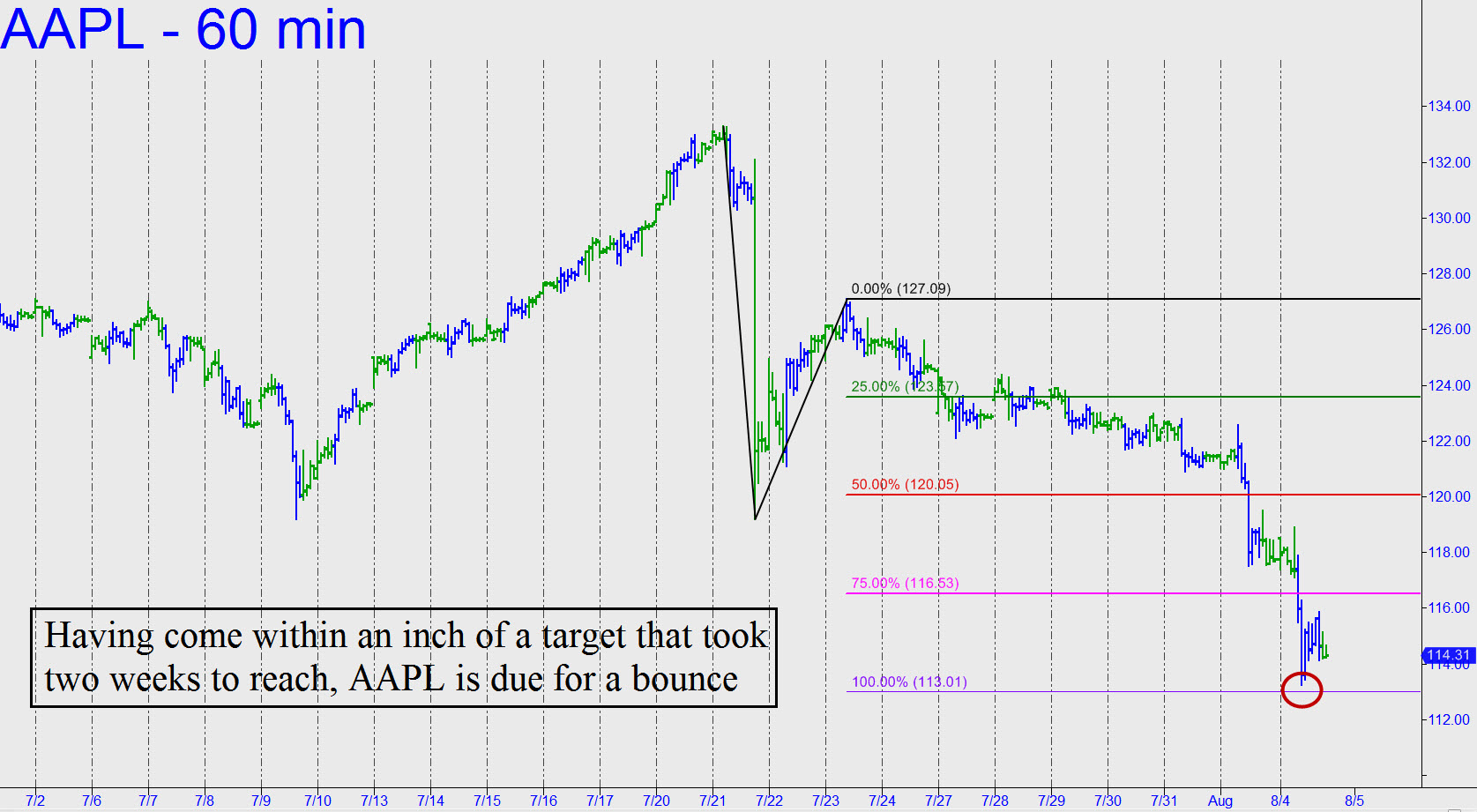 From a technical standpoint AAPL is due for a bounce. Notice in the chart that yesterday’s low got within a hair of a 113.01 target that had been two weeks in coming. Under the circumstances, we should expect the bounce to last at least 3-4 days; any less and Apple would be warning of another leg down. We’d consider it merely corrective, however, if it fails to exceed 104.63 to the downside. That’s where a key low was recorded in January, and its breach would generate a bearish impulse leg of weekly degree. That hasn’t happened in nearly three years, when AAPL was in the throes of a slide from 100 to 55, and it therefore behooves us to pay attention if the stock gets close. AAPL matters a great deal, of course — matters so much that if it has seen its bull market highs, so have U.S. stocks, and by implication all other stock markets around the world. _______ UPDATE (August 6, 6:37 p.m. EDT): AAPL has been holding its own in a weak market, but don’t expect it to swim against the tide. If it gets pulled lower, use 112.34 for a minimum downside target, or 110.64, worst-case. Alternatively, a rally would likely push this brick up to 116.72. Anything above it would portend 118.06, or even 119.39. ________ UPDATE (August 9, 1:15 p.m.): AAPL carved out a presumably temporary low last week at 112.10, just 24 cents from the target given above. The bounce was all short-squeeze, but we should be careful about getting in its way despite the temptation to short into any rally. This one would need to exceed 122.57 over the next few days to suggest DaBoyz have the muscle to wring more than just a few points from bears.