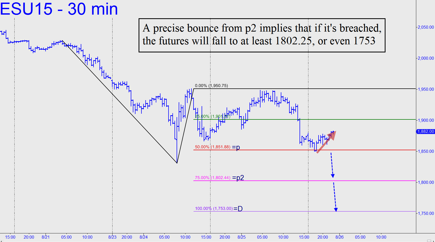 The pattern shown in the chart, with a horrific worst-case target of 1753.00, is the one we should use for now, since it has been confirmed by a so-far 30-point bounce from within 1.25 points of the 1851.75 midpoint pivot. The target is equivalent to an approximately 1000-point drop in the Dow. I published it in the chat room (adjusted for a slight error in my choice of point ‘a’ highs) shortly before the closing bell, but no one seems to have taken advantage of it. Be that as it may, the futures can be ‘mechanically’ shorted from p=1851.75, and/or p2=1802.25, provided you thoroughly understand the rules of the mechanical trade. Alternatively, the most bullish thing the stock market has going for it is that it will be irresistibly tempting to short it every step of the way higher. A week or two of that attitude, and we could see new record highs.