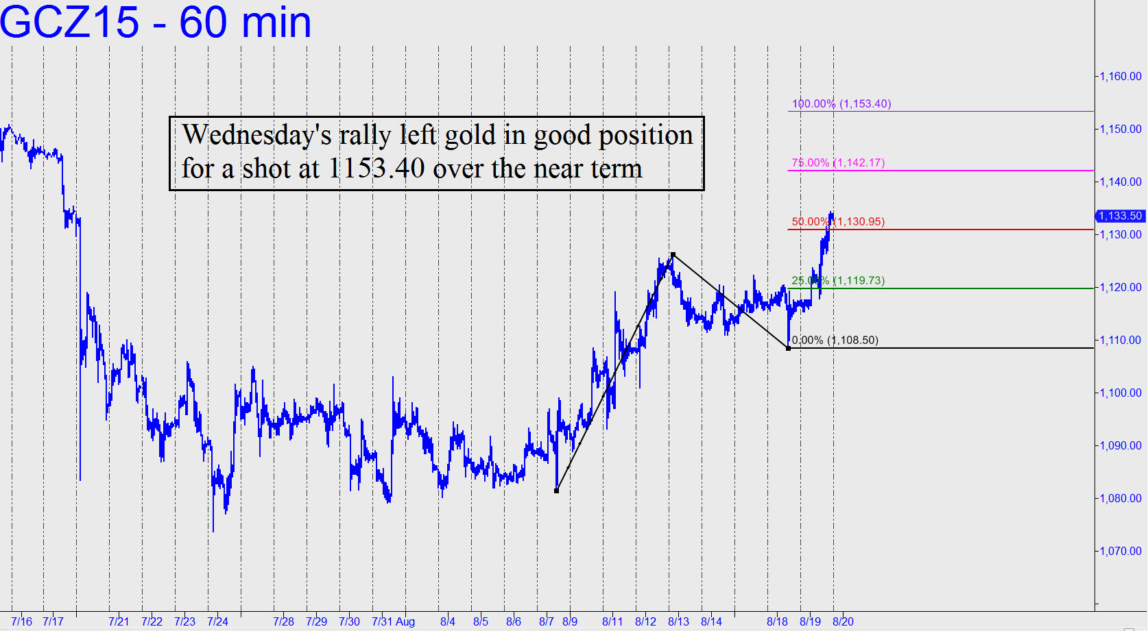 Gold futures have been stair-stepping higher for two weeks, pausing precisely at each Hidden Pivot in a succession of rally targets that I’ve posted in the chat room. The bullish pattern I recommend using for this move is shown in the accompanying chart, and it leaves room for more upside over the near term to 1153.40. The midpoint resistance has already been breached, indicating that the rally is likely to reach a minimum 1142.20 today or tomorrow. Night owls who fully understand the technique should consider a mechanical entry on a pullback to p=1131.00, stop 1127.50. _______ UPDATE (7:55 a.m. EDT): The futures topped overnight at 1141.80, four ticks from my target. If any subscriber is still long for the presumptive final push for this cycle to 1153.40, please let me know so that I can establish a tracking position. Strictly speaking, the ‘mechanical’ trade I’d suggested would not have filled, since the pullback came down only to 1132.10, missing our bid by a small but crucial $1.10. Given the bullish target, however, there were other ways to get aboard, as some of you may have discovered.