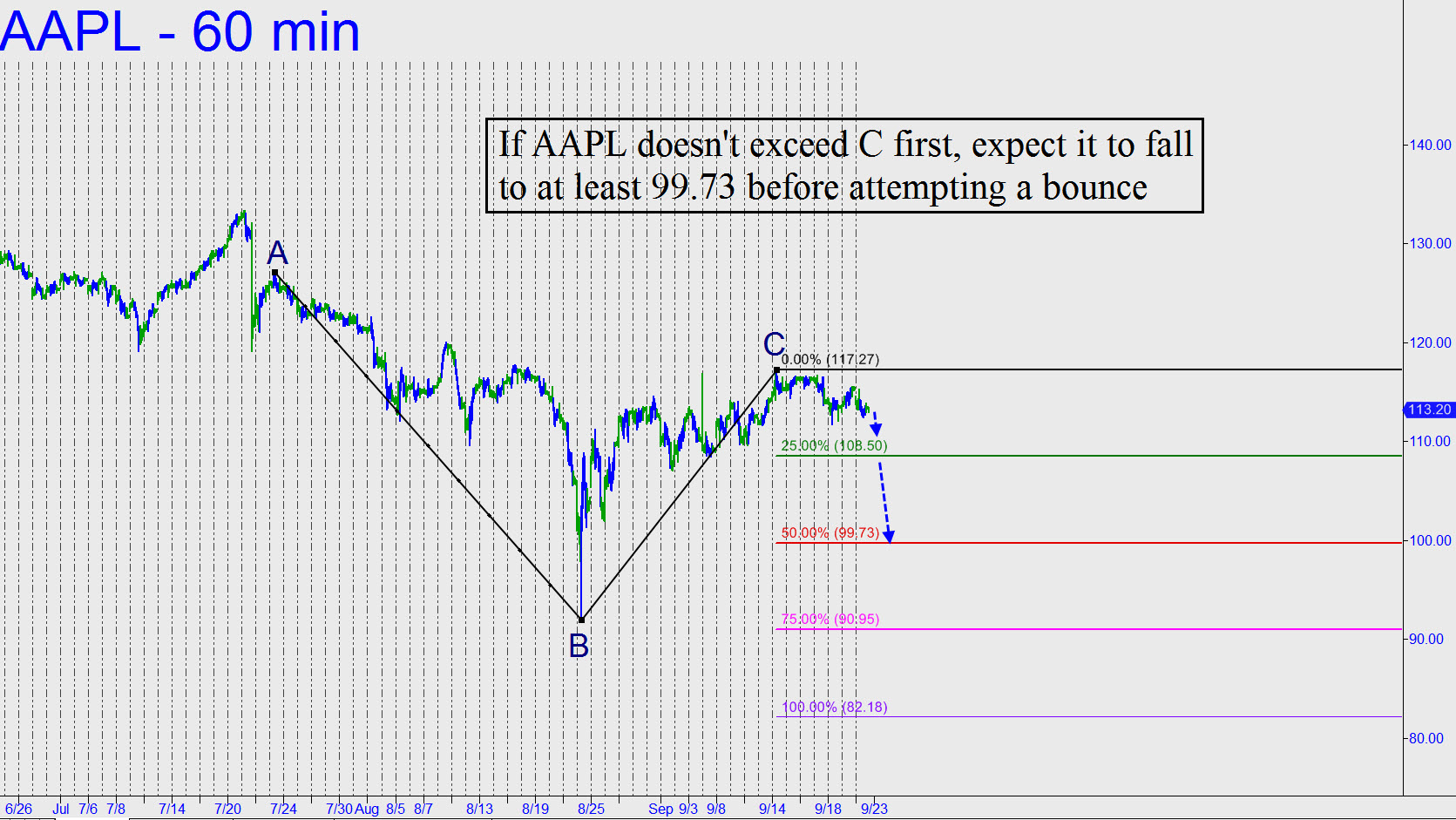 For the time being, however, we will continue to view the rally from the August 24 low as prelude to another big leg down. If so, once the 108.50 ‘trigger’ is hit (see inset), the weakness could continue all the way 82.18 (see inset). Along the way, and assuming the stock doesn’t first head-fake above 117.27, a key test will come at 99.73, a midpoint Hidden Pivot that can serve for now as our minimum downside objective. If the stock breaches the support by more than 1.20, or closes beneath it for two consecutive days, the p2 pivot at 90.95 would become our new minimum target. ______ UPDATE (September 28, 11:03): The thimble riggers who manipulate this stock for a living have done a quite creditable job keeping it stable when the broad averages were getting schmeissed. This suggests they aim to take it higher if and when the stock market turns buoyant. More immediately, if AAPL follows shares lower today, look for a rally attempt at 111.74; or failing that, at 111.04. Either of these Hidden Pivot supports can be bottom-fished with a stop-loss as tight as you want to make it. To find them on the 30-minute chart, use a=115.24 on 9:25 at 4:00 p.m. _______ UPDATE (September 30, 1:10 a.m.): Apple shocked yesterday by crushing both of the Hidden pivot supports given above on the way to a 107.86 intraday low. This implies the sleazeballs who control the stock are having trouble distributing it ahead of the next swoon. It is weaker than I had imagined.