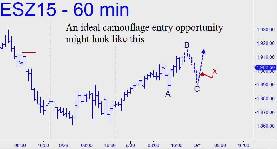 Your trading bias should still be bullish, however, and the best opportunity to get long belatedly would come via ‘camouflage’ following a set-up similar to the one I’ve sketched. Whatever occurs, continue to be mindful of the fact that phony rallies on light volume engineered by sleazeballs can take on a life of their own. This one already has, and although I seriously doubt that it will achieve new record highs, if that’s what it takes to turn the stock market into a Biblical Red Sea for bulls and bears alike, that’s exactly what will happen. _______ UPDATE (6:45 a.m.): Even on zero volume in the dead of night, DaBoyz were unable to squeeze the futures to 1930.00, where I’d said the rally would start to look interesting. The actual high of the 20-point rally engineered by the night shift was 1129.75, two ticks shy of the goal post. A chat room denizen reported getting short at 1929.00, stop 1931.50. Nicely played! For any subscriber who did likewise, it’s time to take a partial profit, since the futures have sold off by 11 points. Do NOT get the crazy idea that this is the end of it. DaBoyz will try again, possibly using Friday’s payroll data to put the squeeze on bears. My hunch, though, is that it won’t have to wait that long. _______ UPDATE (1:56 p.m.): A key-reversal day! The Dow has plummeted 400 points so far from the overnight high recorded for the mini-futures contract. This delightful turn of events will have trapped more than a few bulls, creating a ponderous layer of supply between 16000 and 16350. Let’s see now if DaBoyz can pull out all the stops on tomorrow’s payroll data to create a rally they can distribute into. With any luck, the ‘news’ will be bearish and they too will get sandbagged, albeit only temporarily.