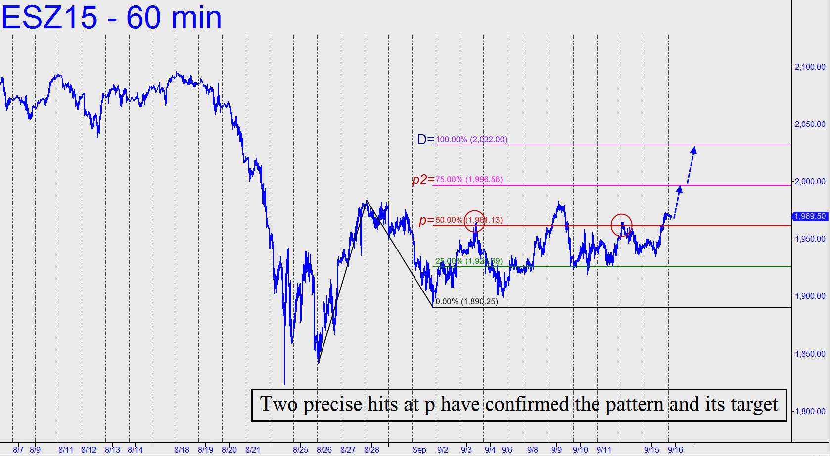 With two pullbacks precisely from the midpoint pivot, the pattern shown is the one we should use to project the next move. It seems likely to be up — at least to the 1996.75 ‘p2’ pivot, or possibly to D=2032.00 if any higher. Both of these Hidden Pivots are short-able with tight stops. However, if the latter number is reached, you can be certain that bulls and bears alike will be fixated on the prospect of new record highs, and that will give short-covering a life of its own. A further implication is that any rally that closes above p2=1996.75 for a day or two will shorten the odds of a record-breaking (or -tying) push significantly. I raise the point because, judging from the discussion in the chat room, some of you appear to be growing more bearish than Hidden Pivot analysis would seem to warrant. Today’s price action is likely to be fly-or-die crucial in any event, since it would take a mere 15-point thrust to generate a powerful new impulse leg on the hourly chart. _______ UPDATE (10:29 p.m. EDT): With the futures in a shallow pullback after a strong rally, DaBoyz were having trouble Wednesday night trying to shake loose some bargains. Accordingly, we should look for the rally to dance on or just beneath the numbers furnished above, with potentially tradable implications at each.