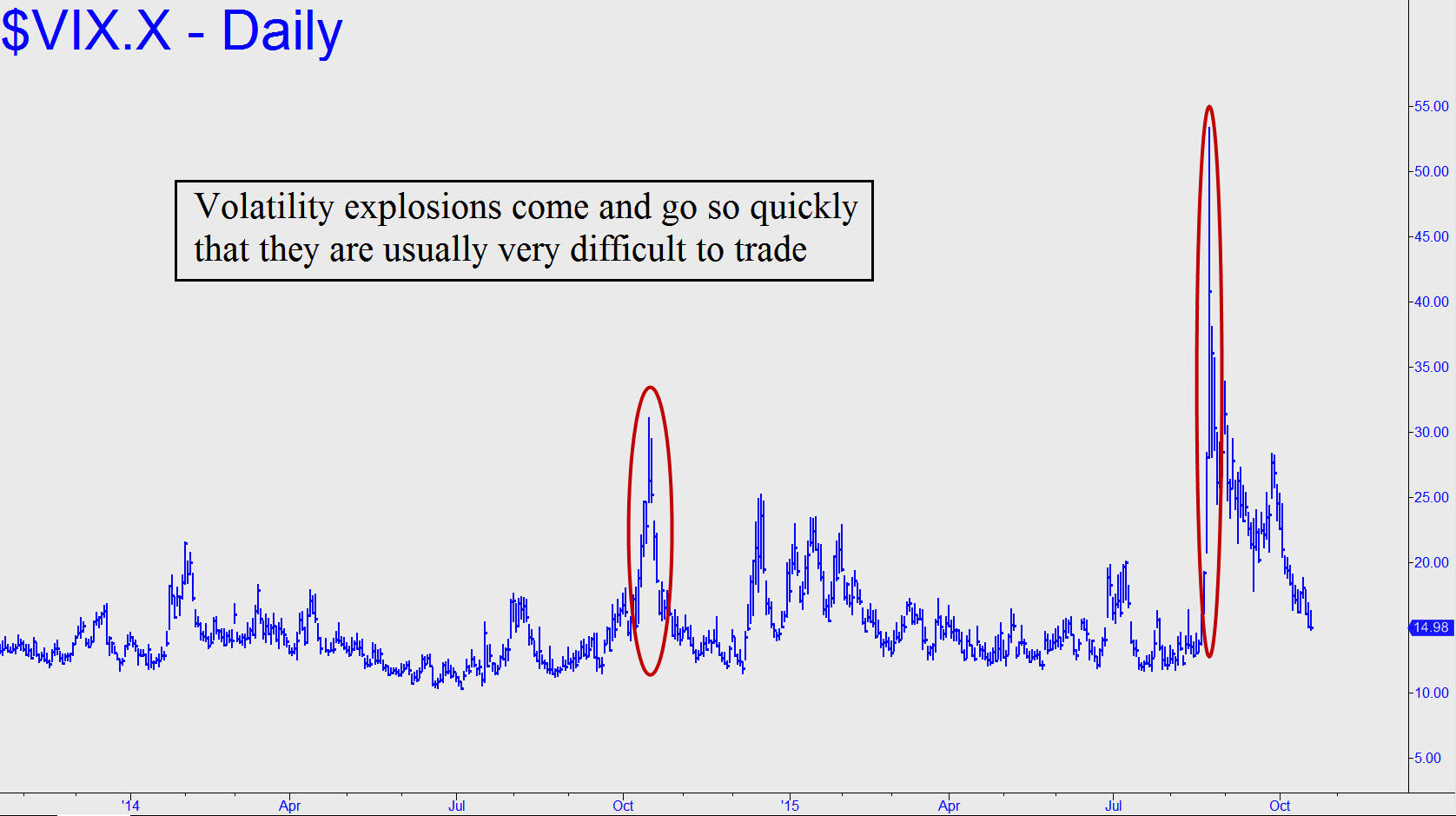 Prolonged periods of tedium often precede explosive changes in volatility, and that’s probably why expectations of ‘something big’ appear to be waxing in the Rick’s Picks chat room lately. It’s been nearly a month since stocks sold off hard in August, and the choppy bounce from the lows since then has depressed option ‘implieds’ to levels where straddles are starting to look enticing. This seduction has lured many a trader onto the rocks, but the urge need not be fatal. Check out today’s VIX tout for a trade suggestion that offers a less daring approach. If you don’t subscribe, click here for a free two-week trial subscription. It will give you instant access not only to Rick’s daily trading ‘touts’ and intraday updates for stocks, options and index futures, but to a 24/7 chat room that features seasoned traders from around the world and actionable ideas in real time.