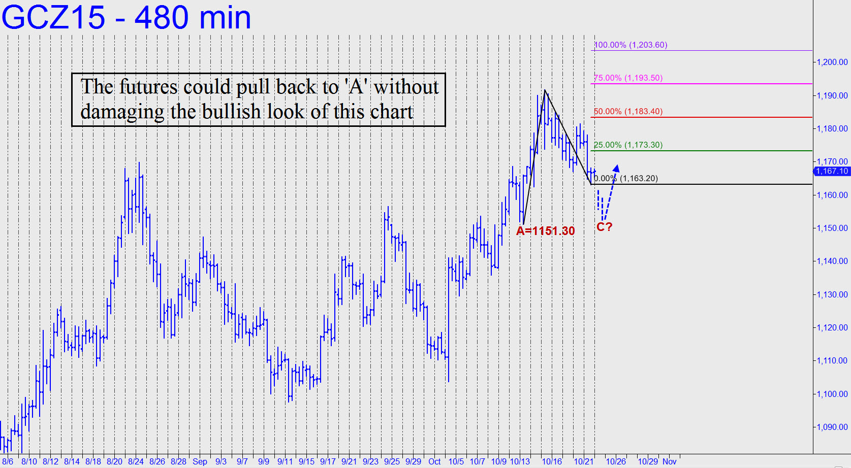 We’ll give the December contract a little more leeway to the downside, lest we get fooled into turning negative prematurely. The pattern shown is of greater degree than the one we used earlier that had allowed room down to 1162.50 before generating a bearish impulse leg. This one has a prospective point A low at 1151.30, and a pullback to within a point or two of it could set up the kind of low-risk buying opportunity that we look for. If the futures should instead hit 1173.30 on a rally without going any lower, that would turn our short-term trading bias bullish. ______ IMPORTANT UPDATE (Saturday, 3:35 p.m.): In the chat room just now, I have raised the yellow flag. Specifically, check out my 13:06 post concerning a danger signal flashed by a chartist colleague of mine whose technical work I greatly respect. Not a subscriber? Click here for a free two-week trial subscription. It will give you instant access not only to all of Rick’s daily trading ‘touts’ and intraday updates for stocks, options and index futures, but to a 24/7 chat room that draws veteran traders from around the world..