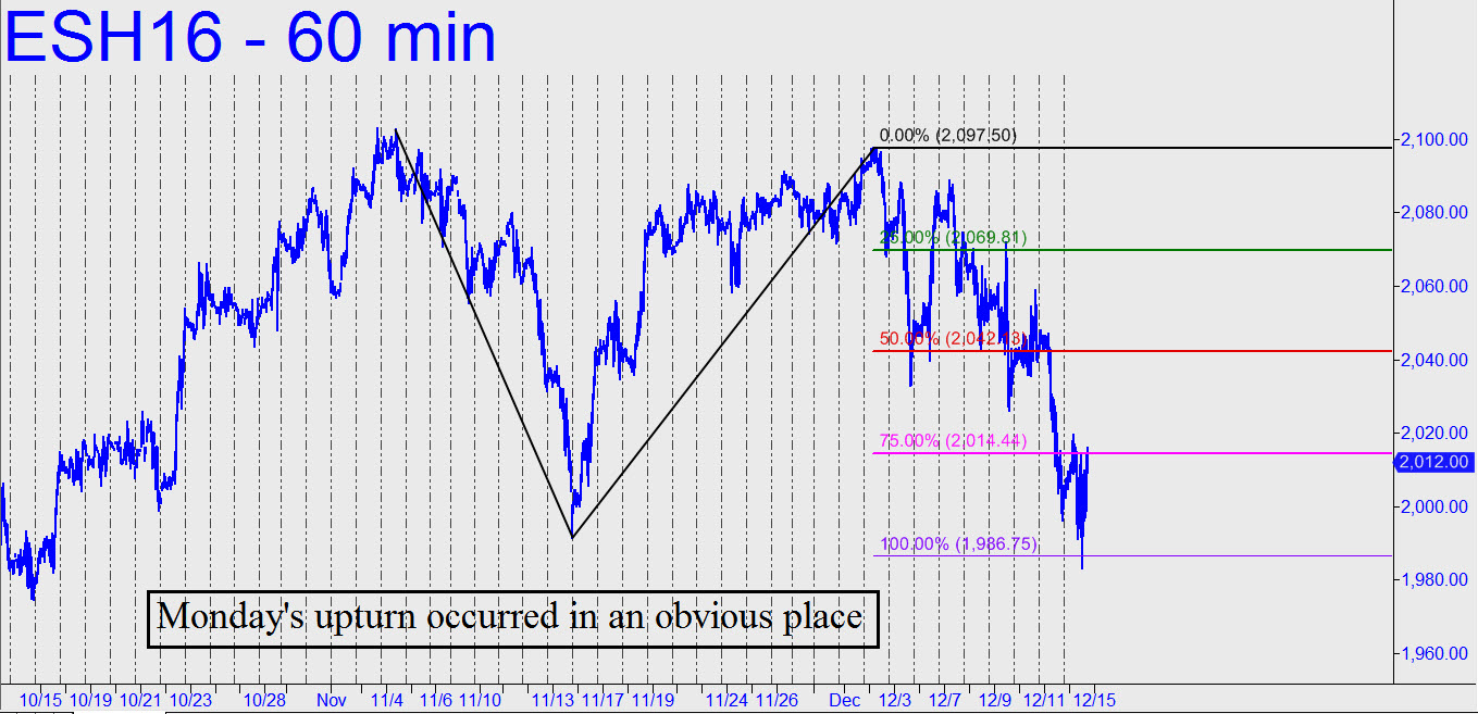 The stock market continues to act as though every speculator on the planet is short: minor downside targets are going unachieved; fleeting lows are quickly reversed, leaving gratuitous feints and swoons all over the intraday charts; and, DaBoyz have been ‘running ’em up’ in the final minutes of the session. Considering that all of this has been occurring in the context of a downtrend that has prevailed for more than a week, one might think it would be easy money for bears. In fact, aside from last Friday’s steep plunge, it has been torture every inch of the way. As for the bulls, although they may have found the short-squeeze rallies exhilarating, their losses have mounted over the past week due to the downtrend, however erratic. Considering the foregoing, I’ll eschew a detailed prediction for Tuesday and mention only that Monday’s bullish reversal came from a predictable spot — i.e., the 1986.75 target of the pattern shown. That should be it for the downtrend for a while. However, because the target, a fairly important Hidden Pivot support, was breached by a relatively significant 5.25 points, we shouldn’t expect a sustained bounce. Yellen is scheduled to blather and bloviate on Wednesday, and if there is anything in her speech that can be construed as even remotely bullish, DaBoyz will use it to squeeze from beleaguered bears what little life remains. The implication, of course, is a rally that would trap bulls even more viciously. UPDATE (1:47 p.m.): The 2045.75 rally target that I posted in the chat room nearly five hours ago (see 9:05 entry) appears to have caught the high of the day to the exact tick. I will establish a tracking position if I hear from at least a few subscribers who used it.