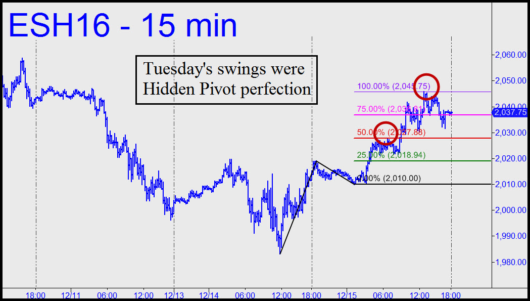 Tuesday’s strong rally topped to-the-exact-tick at a 2045.75 target I had posted in the chat room 25 minutes before the opening. Judging from posts in the room during the day, at least a few subscribers were able to make hay with the target, a minor Hidden Pivot. I am not establishing a tracking position, however, because the S&Ps have been too squirrely. This may seem like a contradiction, since we were able to nail most of Tuesday’s swings almost to the penny. But that’s because the charts we used bore valuable price information that had accumulated overnight. My end-of-the-day advice was to cash out — in this case for as much as a $750 profit per contract. As we attempt to repeat our success on Wednesday, the best way to stay apprised in real time will be to monitor the discussion in the chat room. It’s the best I’ve seen in a while, drawing quite a few active traders who know how to use the Hidden Pivot Method and who have been sharing timely ideas generously.