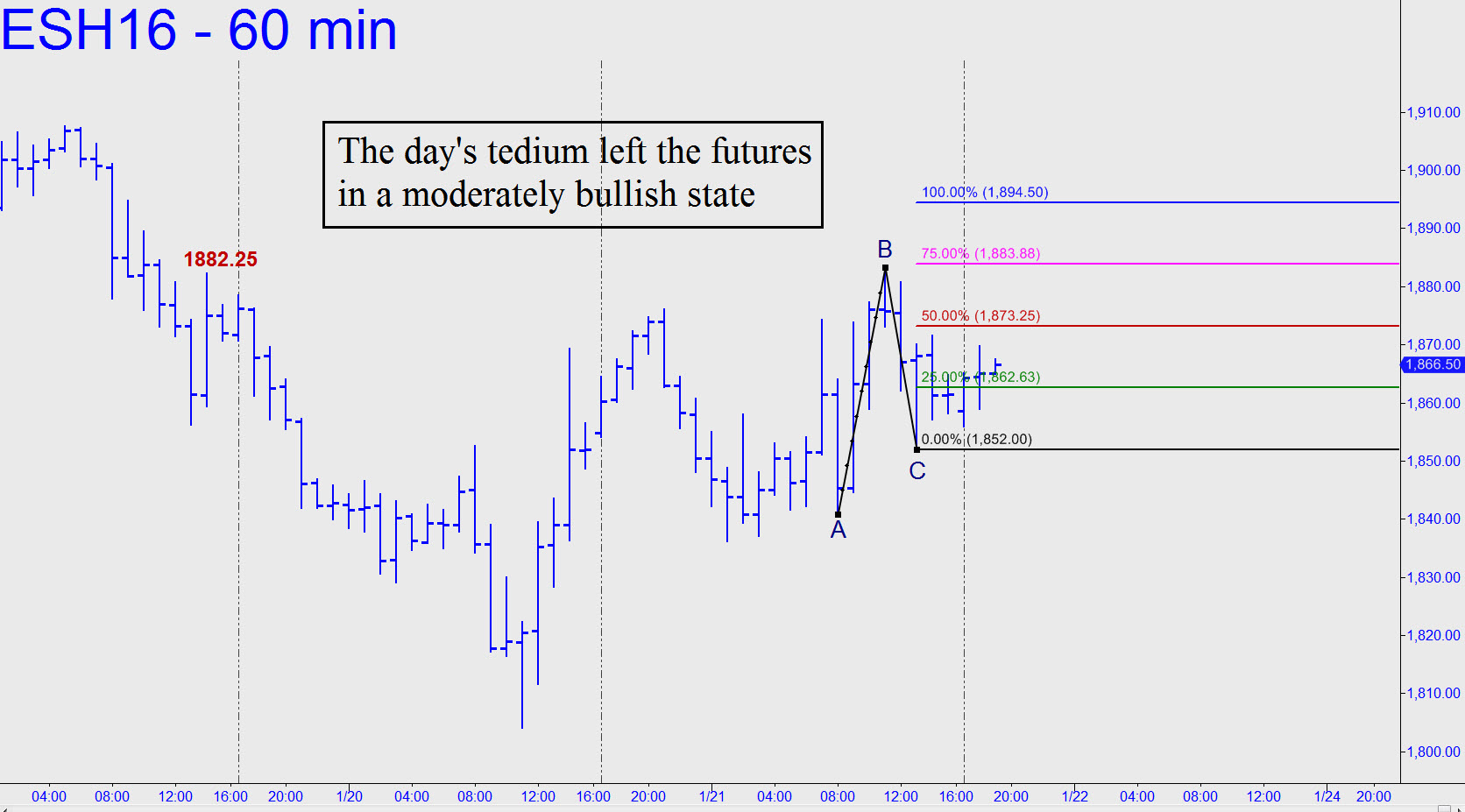 Amidst Thursday’s constipated tedium, the futures never quite got airborne. As is so often the case, they made a key high outside of regular hours, at 11:00 p.m. Wednesday night. After screwing the pooch for the next 14 hours, the March contract somewhat exceeded the overnight high, although not by much. This could hardly have inspired bulls; however it is not bulls who are doing most of the buying these days, but short-covering bears. Are they anxious enough to send the futures into a short-squeeze rally? My hunch is that they are not quite there, but that they are nervous enough to prevent stocks from falling by much as the week draws to a close. In any event, traders should approach this rabid weasel with a moderately bullish bias, given that the afternoon session produced the bullish AB impulse leg shown, along with the beginning of a potential CD leg that could hit 1894.50. That would be no big deal, but if it happens just before the final bell, or if the target is exceeded on a closing basis, the pressure would remain on bears when index futures resume trading Sunday evening._______ UPDATE (9:50 a.m.): Rarely failing to leave us unsurprised, or to catch us totally awares each day, ES has rallied 26 points so far, to within three ticks of the 1894.50 target that I posted here last night. You could have made as much as $1300 per contract by being long. Now, use your gains to provide a generous stop-loss on a short from near the highs.