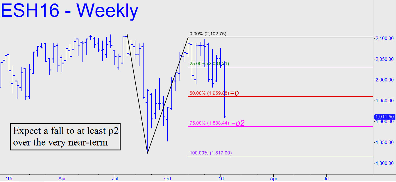 With stocks falling hard, this vehicle has moved very predictably and precisely to Hidden Pivot targets broached here in the past week. On Friday, for one, a bull-trap rally an hour before the opening topped to-the-exact-tick at a Hidden Pivot resistance I’d billboarded with this post in the chat room: “ESH has just popped psychotically through p=1951.38, [making] D=1964.75 a certainty.” Ten minutes later, the futures in fact made their intraday high at 1964.75. Anyone who got short there could have reaped a windfall, since the futures fell for the rest of the day, hitting a low at 1910.00 that would have been worth as much as $2650 per contract. That low lay just a single point from the bearish target at 1911.00 that I’d disseminated the night before as a minimum downside target.