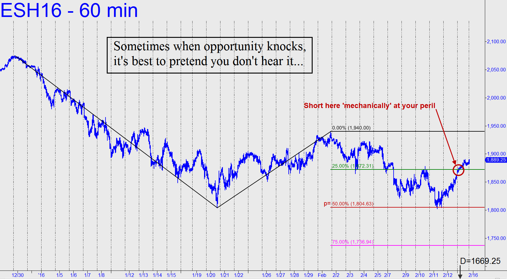 The large downtrend shown tripped a ‘mechanical’ short on last week’s rally back up to the green line, but I’m going to pass this one up rather than try to be a hero. The first rule of the ‘mechanical’ trade is to initiate them only when you are confident that a ‘D’ target– here 1669.25 — will be reached. In this case, however, although the bearish pattern is well confirmed by the precise bounce from the red line, bears have yet to escape the vicious squeeze begun from last Thursday’s low. Although shorts can still be initiated via ‘camouflage’ using the pattern, since the green-line signal noted above has in fact been triggered, the hourly chart doesn’t look too promising for bears at the moment. Actually, if this short-covering rally continues above the 1940.00 point ‘C’ high of the pattern, after having gone no lower than p=1804.63, it would be warning bears to dive for cover, since, by my runes, a possible test of late December’s highs near 2075 would become no worse than an even-odds bet at that point.________UPDATE (7:02 p.m.): Tuesday’s short-covering spree, which peaked at 1992.75, did not change the outlook and analysis given above. The futures would need to dive below 1833.50 today to even hint of possible trouble in Wall Street’s delusional Shangri-La.