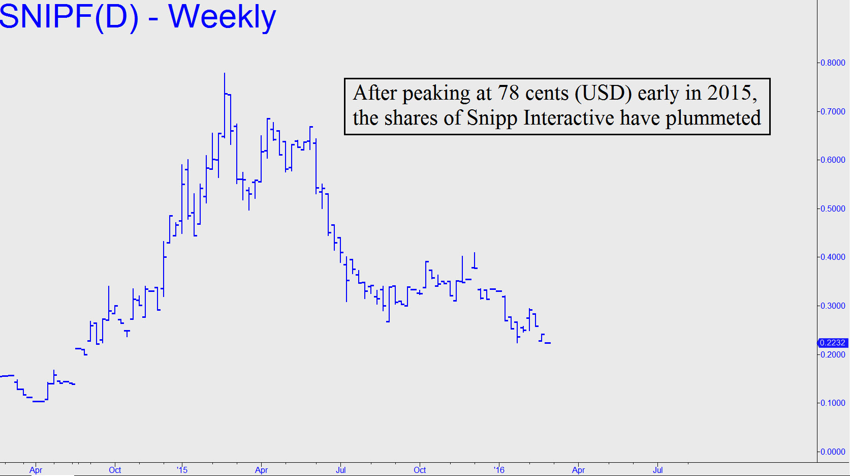 I had enthusiastically recommended this stock when it was selling for a little more than a dime a share in 2014, but it has turned into a major disappointment. To be sure, the company continues to grow its roster of A-list clients with such household names as Pfizer, Sunoco, Heineken, AT&T, Pepsi, Honda, Clorox, Kellogg’s, Walmart, L’Oreal, Nestle, Kraft and quite a few others; however, its share price has fallen steeply nonetheless (see chart inset). Two possible reasons stand out. One is that Snipp expanded its payroll in 2015, mainly through acquisitions, far faster than its revenues. The firm’s CEO, Atul Sabharwal, says the acquisitions were sound and that they will begin to pay off in 2016. In the meantime, though, he admits that Snipp is likely to experience digestion pains until the employees, many of them software engineers rather than salespeople, are assimilated and duplicate positions are eliminated.