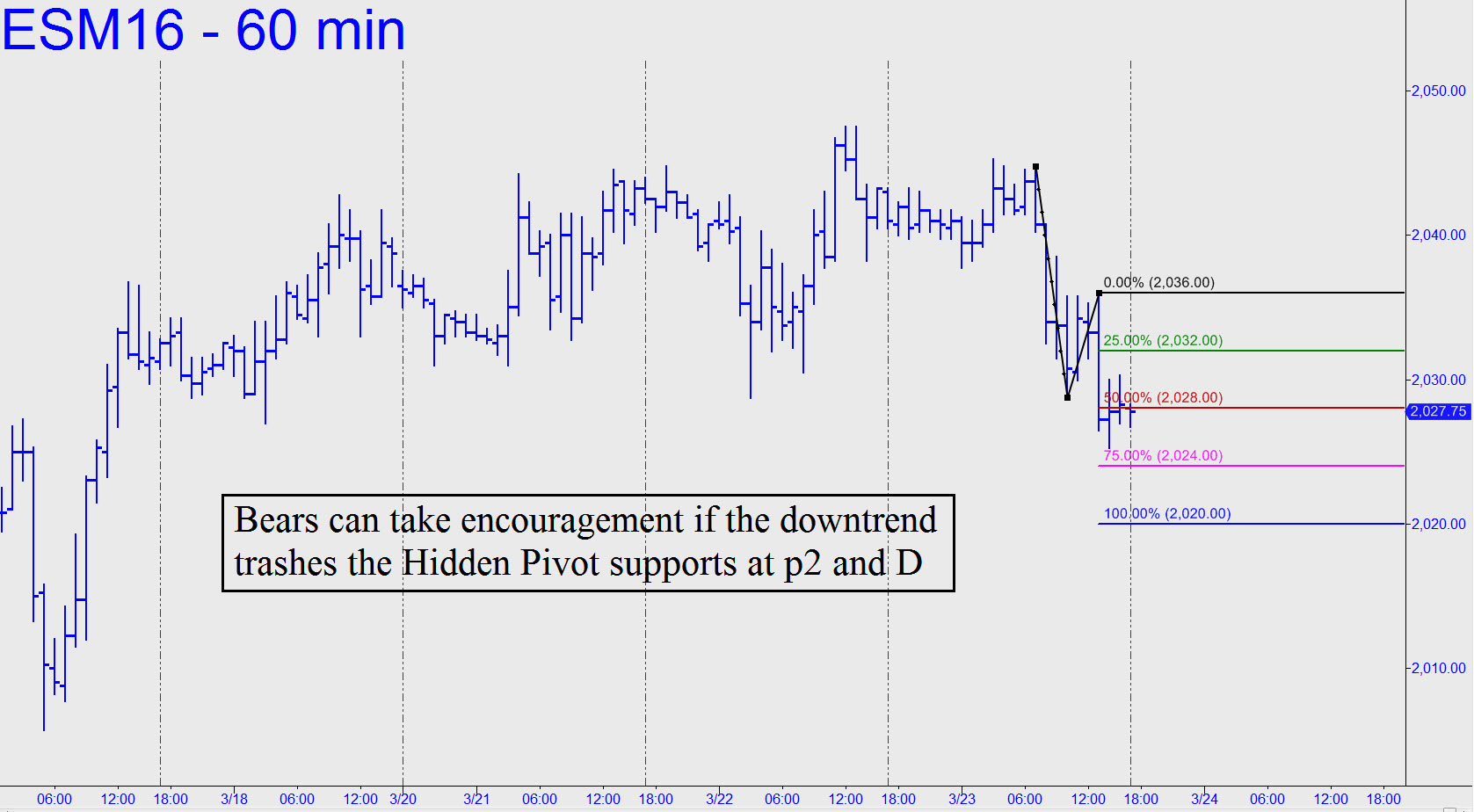 In the chat room, several subscribers reported using the 2047.25 target I’d been drum-rolling here for a week to get short a single tick off the intraday high. The futures fell nine points thereafter, allowing us to cover half of the position for a profit of as much as $450 per contract. For purposes of establishing a tracking position, I’ve used 2040.00 as the exit price, 1.75 points off the retracement low. That leaves us short two contracts whose cost basis I’ve adjusted to 2054.50. For now, use a stop-loss at 2051.25. We should entertain no illusions about having nailed a major peak in a bull market that has been blithely chugging along for more than seven years. The purpose of the trade, besides satisfying the urge that each of us permabears has to get short at an important top, is to do so with relatively little stress, and to have a chance of turning a profit even if it turns out that we’ve been wrong. Of course, this has been true in each and every instance where we’ve tried this gambit. But that hasn’t stopped us from making a few bucks in the process, as seems very likely to become the case here, while having good fun. _______ UPDATE (March 23, 10:55 a.m. ET): The trade has continued to go our way, with a so-far low today at 2031.50 that would have produced an $800 profit per contract for anyone who got short as advised. Cover a third contract at 2034.25. _______ UPDATE (March 23, 6:53 p.m. ET): The futures traded down to 2026.75, allowing us to easily cover for 2034.25 a third contract of four shorted a day earlier at 2047.25. Imputing the gain thus far to our tracking position leaves us with a single contract whose effective cost basis is 2074.75. We’ll swing for the fences on this one, using a stop-loss for now at 2047.75. If, as has been the case for the last seven years, the S&Ps hit new highs, the position will be closed with a gain of about $1350 for each four contracts originally shorted. My immediate downside target is now 2024.00, or 2020.00 if any lower, but bears should take heart if these Hidden Pivot supports get trashed, since that would shorten the odds that we actually have caught a major top. The new chart shows the relevant pattern. Very tightly stopped bottom-fishing at p2 or d is recommended for scalpers, since these Hidden Pivot supports look likely to produce precisely tradable bounces even if the futures ultimately head lower. _______ UPDATE (March 25, 3:12 a.m.): Bears have only themselves to blame for Thursday’s take-no-prisoners rally. With almost no pullbacks in the final two hours, the upthrust would appear to have been driven almost entirely by short-covering. The buying panic had not subsided by day’s end, implying that when trading resumes Sunday evening, it will be with bears hanging on the ropes and hemorrhaging blood. Not us, though. Yes, it’s true that we are certain to be among the very last to throw in the towel, since our stop-loss is above the recent recovery high. However, as noted above, the position would still show a theoretical gain of $1350 per contract. That would hardly be reason for despair, especially since we will have achieved our goal of making a few bucks despite being ‘wrong’ yet again about THE top.