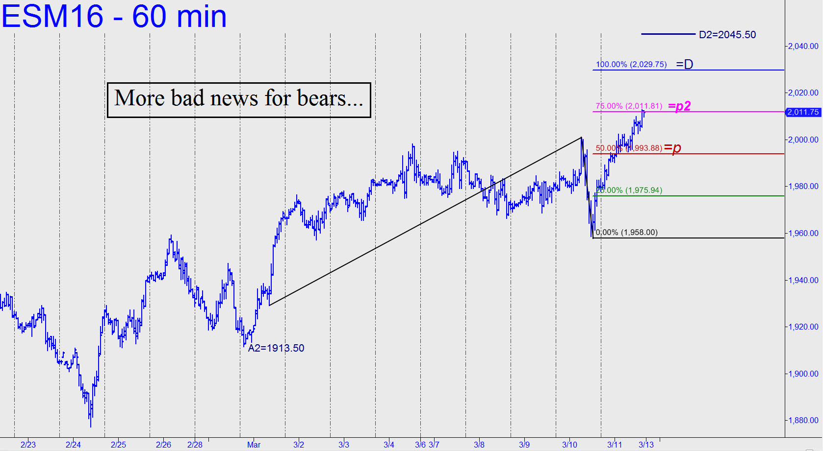 That trade proved to be the relatively easy one of the day, since it precisely achieved its 2001.75 target (albeit at 3:15 a.m.) But for those not already aboard, getting a piece of the presumptive next phase of the rally to 2016.00 was like enduring the Chinese water torture. Short-covering ratcheted the futures, one millimeter at a time, toward the 2016.00 target, which I had flagged as a juicy spot to get short. By day’s end, however, after rallying 33 points from the previous day’s criminally engineered low, the futures had gone no higher than 2012.75. Under the circumstances, it was not possible to get short using my target. Nor should any of you have wanted to, since the intraday high was about to occur minutes ahead of the final bell — which is to say, ahead of whatever potentially world-rattling news might develop over the weekend. (Note: All bets are off if this does in fact happen.)