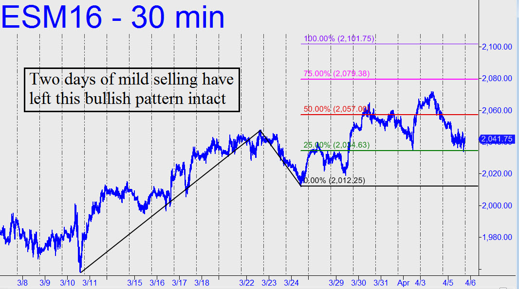 Two days of moderate selling may have inspired hopeful thoughts among bears, but notice in the chart (inset) that the weakness has left intact a bullish ABC pattern projecting 60 points higher. That would be equivalent to about 500 Dow points, presumably enough to bring bears back to reality. Moreover, in theory the pullback to the green line at 2034.63 is a ‘mechanical’ buy, stop 2012.00, for a ride to as high as 2101.75. Instead, I’ll recommend using the ‘camouflage’ technique if you should want to attempt bottom-fishing. That would entail initiating a trade via an uptrending abc pattern on the three-minute chart or lower. The goal would be to reduce the $1100 theoretical entry risk of the mechanical trade to more like $60. _______ UPDATE (12:14 p.m. ET): The mechanical trade would have gotten you aboard with zero pain at the exact intraday low for a ride to as high as 2052.25. If you used ‘camouflage,’ entry would have been triggered at 2040.00, 10:41 a.m. ET, on the one-minute chart. I’ll establish a tracking position if I hear from at least two people in the chat room who took the trade. ________ UPDATE (3:52 p.m.): In the chat room many subscribers reported nailing this trade, so I’ll track two contracts with a profit-adjusted cost basis of 2013.00. This assumes two contracts of four initially purchased were exited at 2057.00, the midpoint Hidden Pivot resistance of the pattern I’d drawn. Now, offer a third contract to close at 2079.00, just beneath the secondary pivot. If the order fills, we’ll go for broke with our last contract, offering it at the original 2101.75 ‘ target. The order should be held o-c-o (one-cancels-other) with a stop-loss on two contracts at 2034.00.