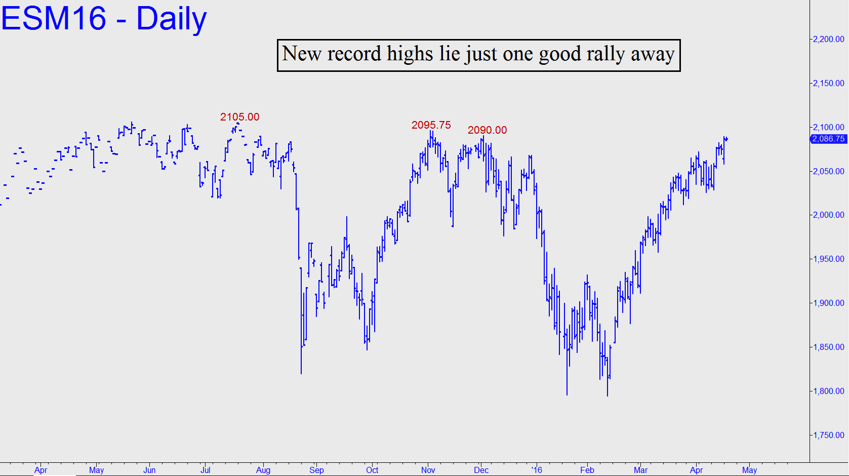 The futures failed to surpass a 2090.00 resistance I’d flagged in the chat-room, topping a single tick below it at 2089.75. The resistance is not a Hidden Pivot, but rather a ‘structural’ impediment tied to an important peak at that price back in December. I say important because it is one of only three peaks remaining that lie between current levels and new all-time highs. The peaks are very closely spaced, with the uppermost at 2105.00, so it wouldn’t take much of a rally to power this vehicle into the record book. As likely as this seems, we should shun the guesswork and simply trade whatever ‘mechanical’ opportunities come our way in the form of impulse legs. These can occur on charts of any time frame, allowing us to cut theoretical entry risk down to mere ticks in either direction. Stay tuned to the chat room if you want witness the process in real time. _______ UPDATE (April 19, 7:56 p.m. ET): The futures spasmed to a new recovery high at 2098.50, leaving the analysis above unaffected.